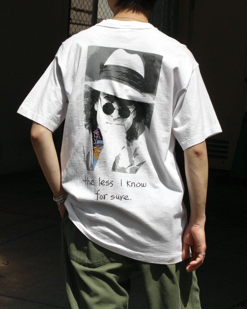 A T-shirt with a single borrowed thyme design released in 1984. Wasnt it made in the 1990s after Johns death? It is a rare design among John Lennons T-shirts, and it seems to be an artistic and missing piece. The L size has a moderately long vertical silhouette, and the color is white. I dont know unless it is exposed to a fairly strong light, but there is some discoloration due to bleaching on the whole. In addition, it is in good condition from a subjective point of view. The tag is sewn afterwards, but it is vintage. Since it is an old product, it rarely deteriorates over time. Please check the photos and understand the characteristics of Vintage before purchasing.