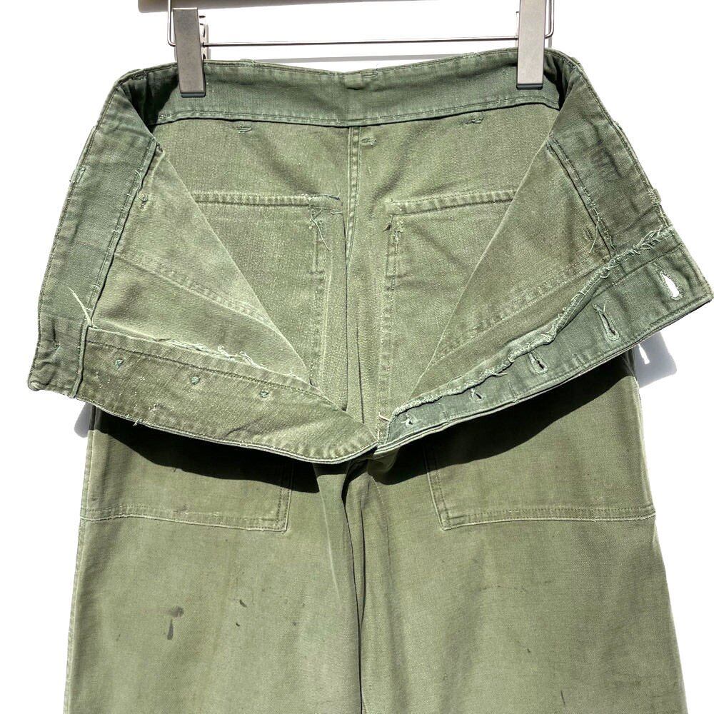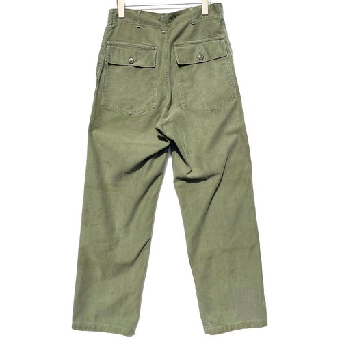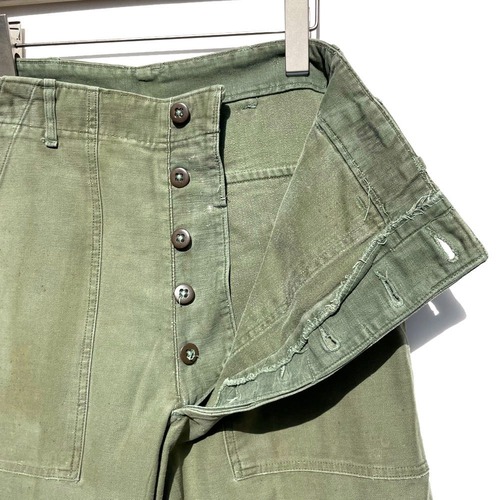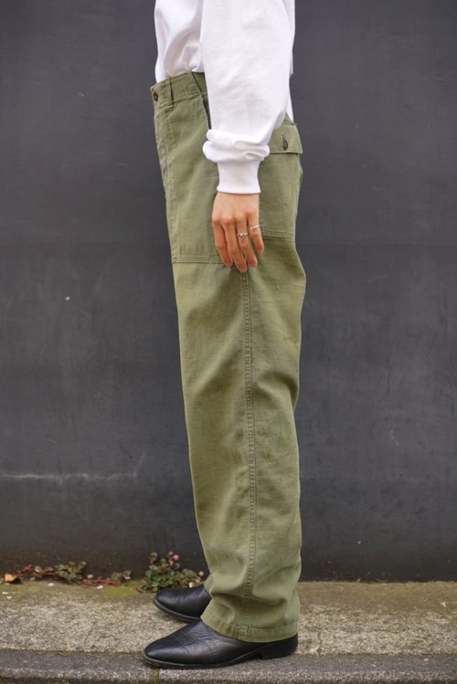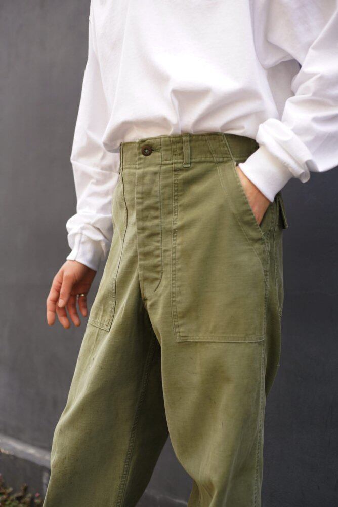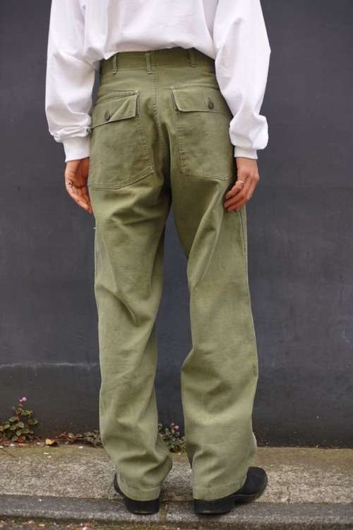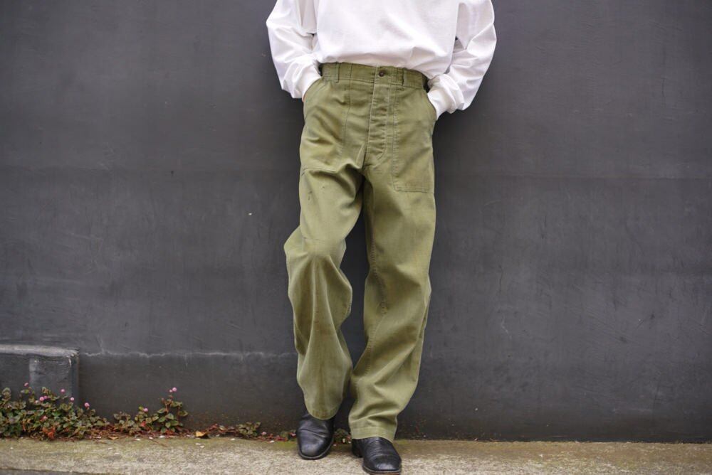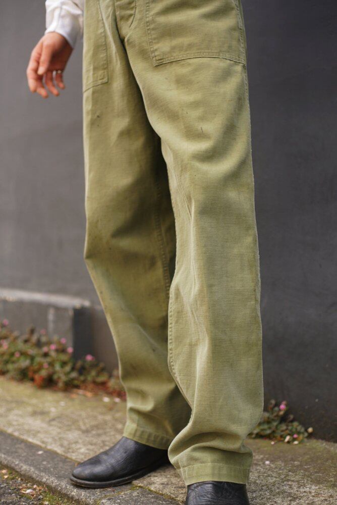 Urea button, double stitching on both outseam and inseam, loose tapered silhouette.
