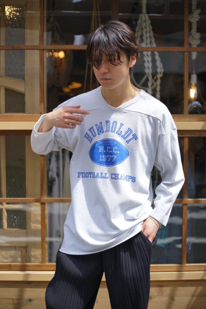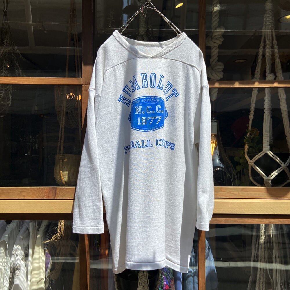 Russells American football T-shirt with hem tag and construction. The cotton-based medium-weight fabric has a vintage-like natural texture. A three-quarter sleeve type that is hard to find in recent years, a silhouette with plenty of space that is valuable for football shirts. The slightly bluish grayish color is a unique expression. It is dirty in some places and is in good condition subjectively as used clothing. Quality: Cotton Color: White SIZE: L [Size] Shoulder width: 63cm Width: 60cm Sleeve length: 51cm Length: 74cm [Model size] Height: 175cm Shoulder width: 43cm B (Chest): 85cm W (Waist): 71cm Rare because it is old There is aged deterioration etc. We try to make the product photos as close to the actual color as possible, but the color may differ from the actual product depending on your monitor settings, room lighting, etc. Please check the photos and understand the characteristics of Vintage before purchasing. * Please refer to here for the measuring method.