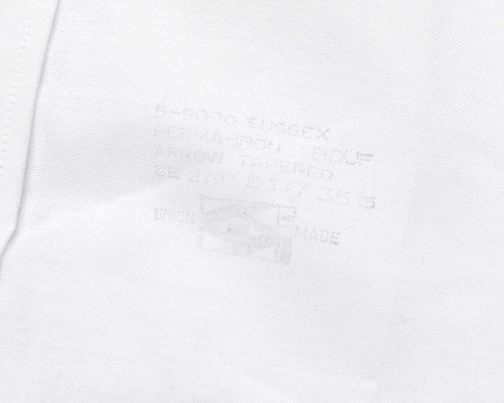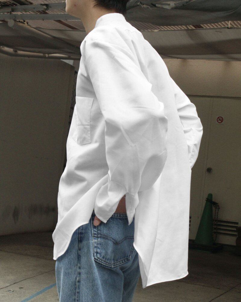 Our original pimpstick remake line dress shirt. A formal shirt made of cotton / polyester fabric that has both softness and firmness is remade on the body. An all-white color with a calm look while showing a solid feel. The collar is removed and the collar is made thinner to give a clean impression around the neck. Considering the overall balance, the sleeve length is shortened and the cuffs are removed to create a silhouette like a wide sleeve. While making the best use of the original length, a slit is provided in the side seam to give a feeling of lacking. It is a utility item that can be worn as a haori like a cardigan. We have calculated a relaxed silhouette and dared to choose a body with a big silhouette. Since we are remaking old clothes, there are rare cases of deterioration over time. Please check the photos and understand the characteristics of Vintage before purchasing.