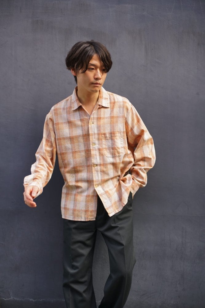 The dull beige color that seems to be vintage, the check pattern with the Kasuri pattern with a rudy atmosphere all over, and the 50s style box silhouette enhance the atmosphere with a classic look.