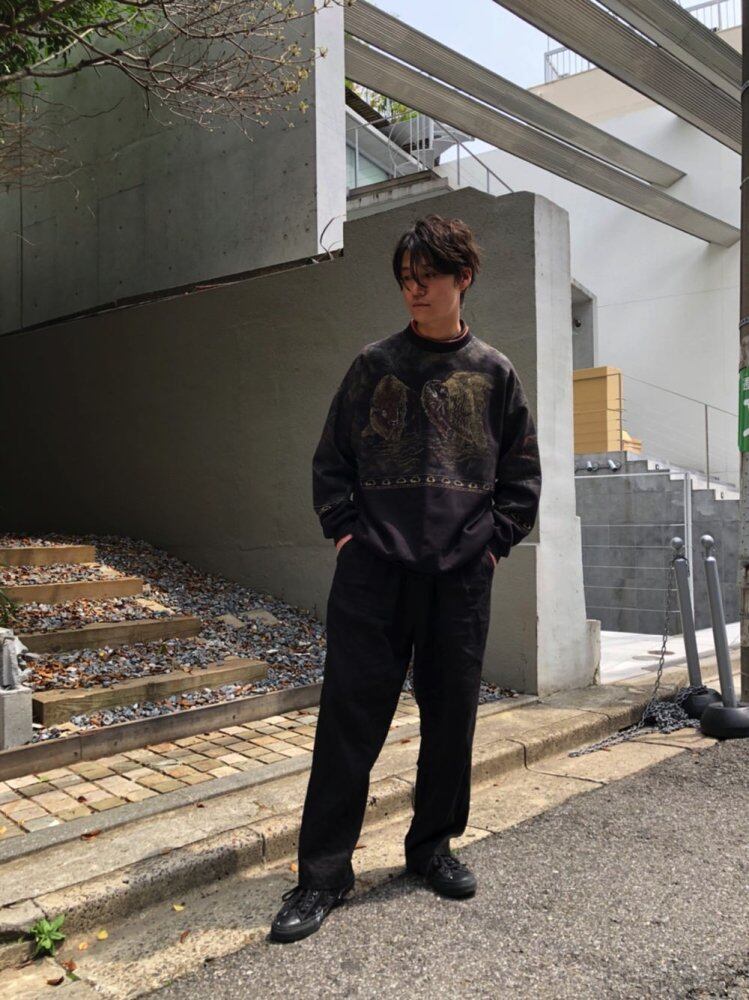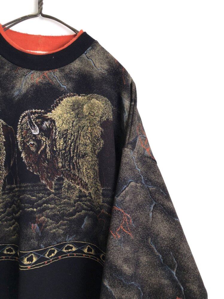 80s sweatshirt A good size vintage sweatshirt with a soft brushed back of cotton and polyester with an American bison pattern printed on a black body.