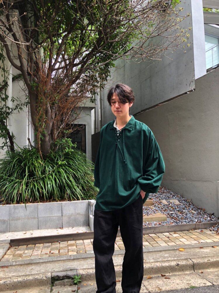 90s German pullover lace-up shirt A soft cotton material with a relaxed silhouette, a voluminous balloon sleeve with plenty of volume, and a lace-up design is one of the romantic images. Deep green shades. Good atmosphere
