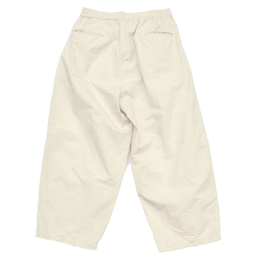 [Round about] 2022 S / S Bespoke fabric at our shop based on the big balloon silhouette pants that have plenty of space around the waist and taper to wide eyes, which is our specialty. The cotton / hemp blend satin fabric has a natural texture and a slightly rough and natural nep feeling, giving it a raw look that seems to soften over time. We have adopted a fabric that is also useful in spring and summer or in all seasons. Easy pants with elastic waist and cord to create a relaxed feeling, while the waist is tacked to give a formal feel like trousers and show a beautiful line. The inseam is set slightly shorter so that the length can be adjusted at the waist position.