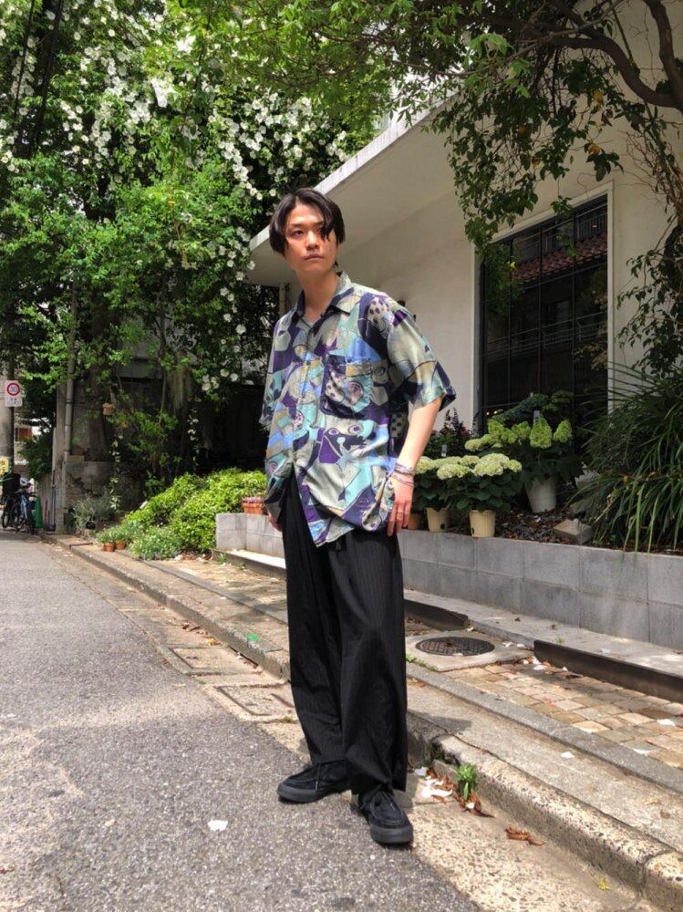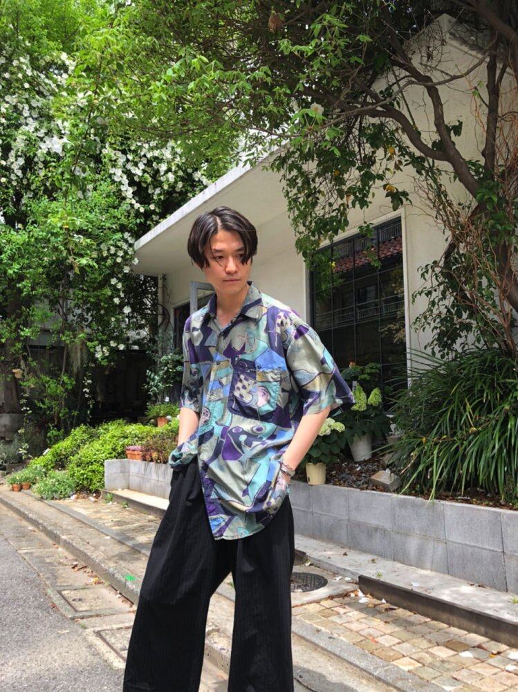 90s short sleeve silk shirt The cool purple, blue and green colors and the large artistic pattern make for a nice atmosphere.