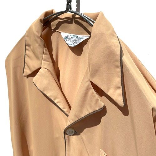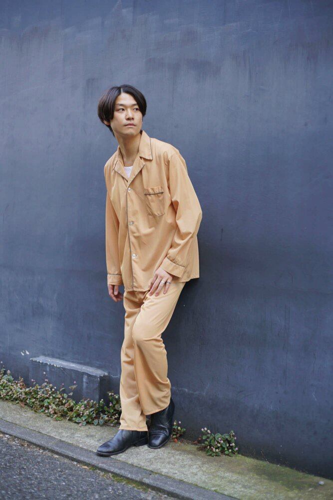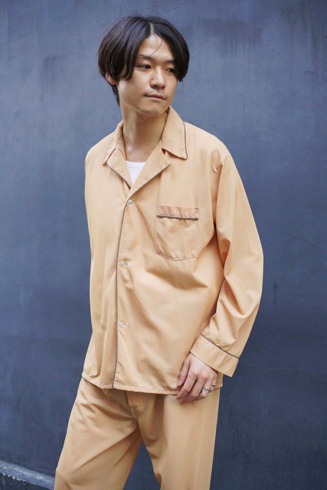 The relaxed style of the three buttons peculiar to vintage pajamas shirts, the rounded collar, and the unpretentious atmosphere create a sense of coordinator.