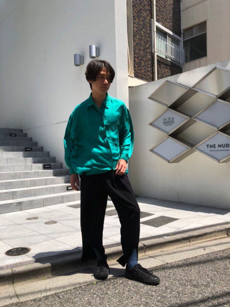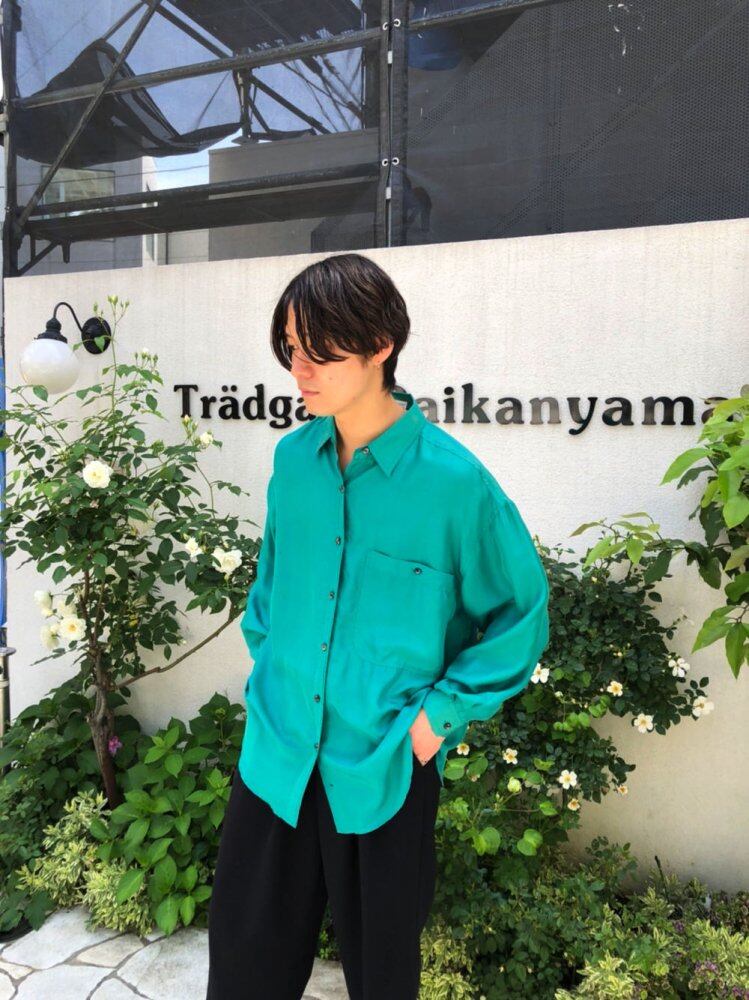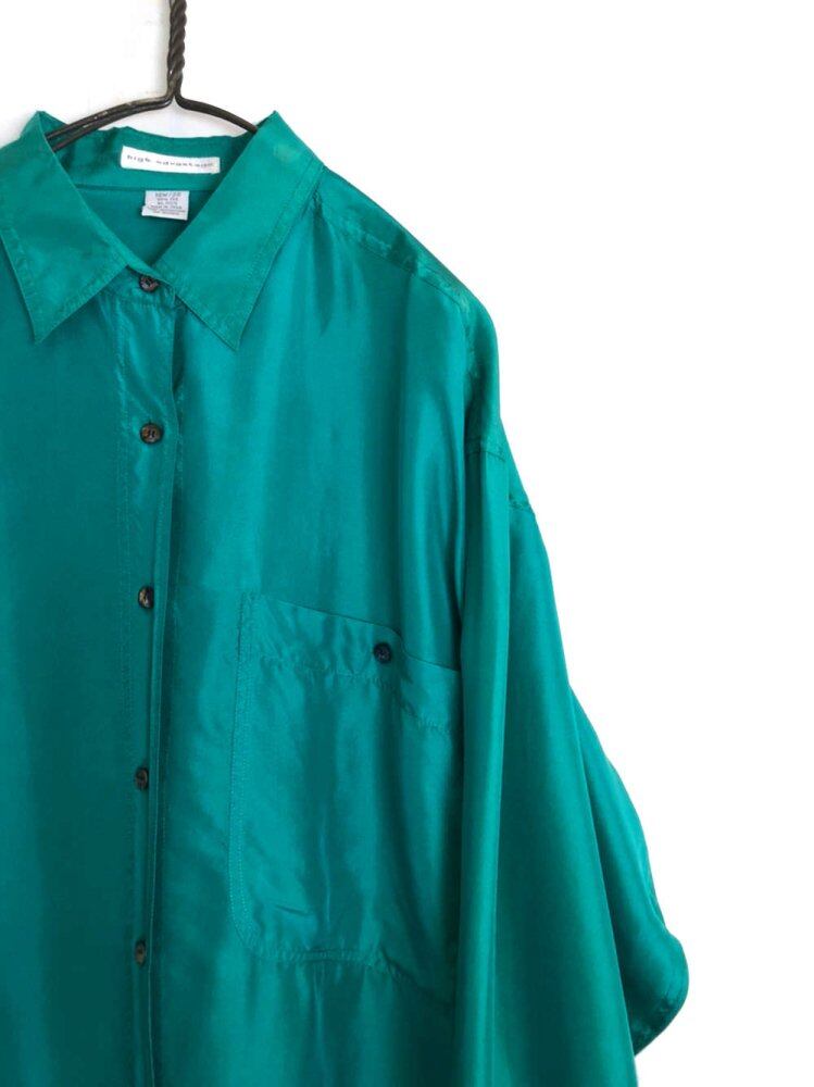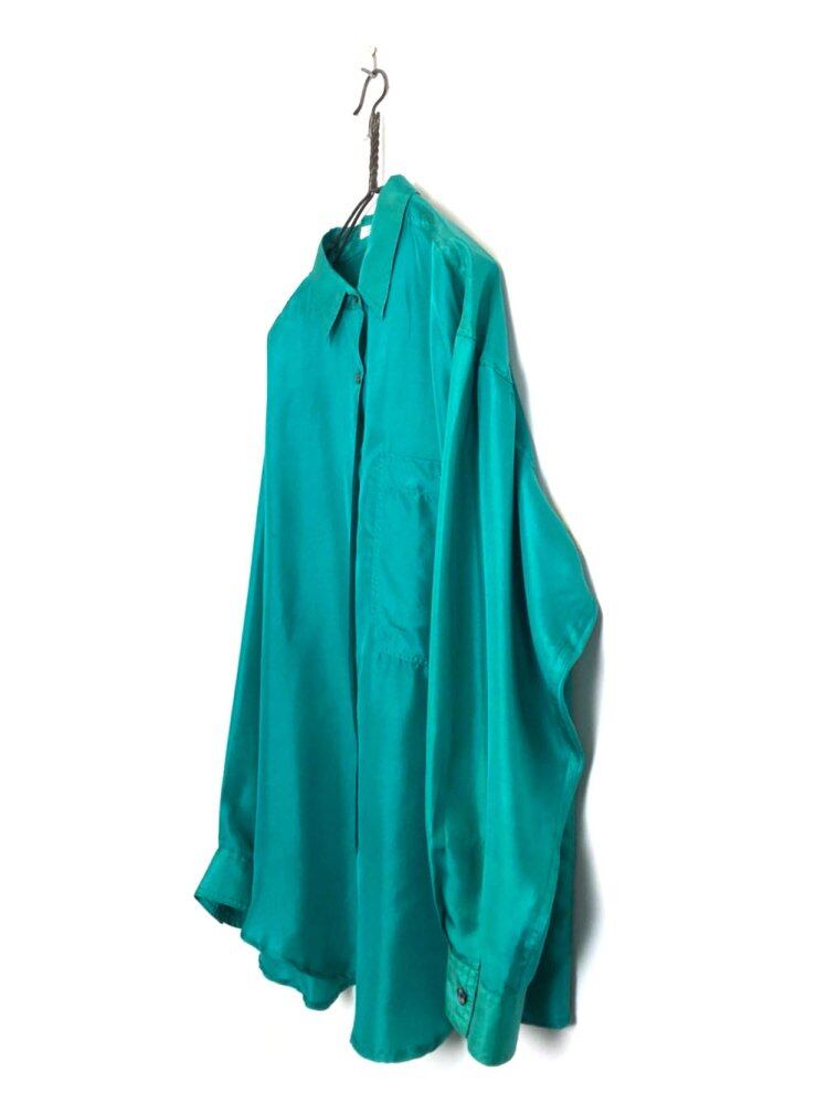 90s long-sleeved silk shirt A bright emerald green shade is an eye-catching piece. A light and smooth satin fabric unique to 100% silk that flutters in the breeze. A good size and good silhouette with just the right amount of space.