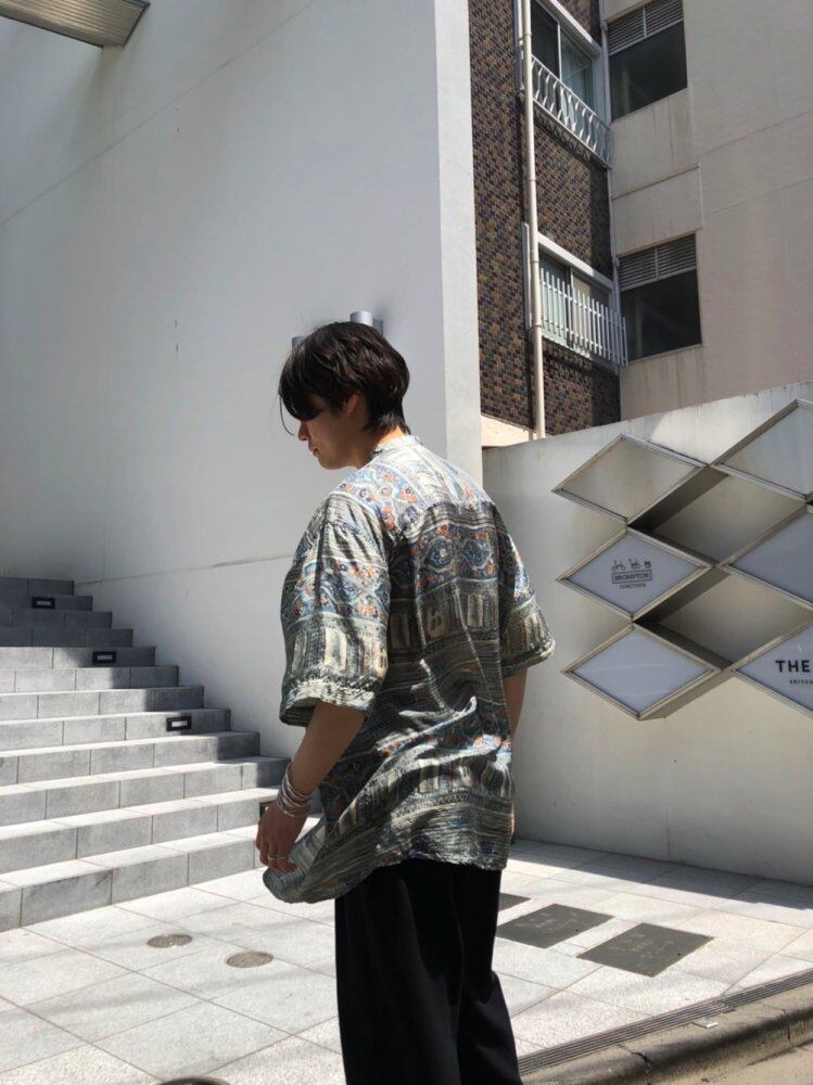 80s short sleeve silk shirt Band color design with a clean impression on a grayish ethnic art pattern Smooth 100% silk fabric that is light enough to flutter in the breeze One piece with a moderately spacious and easy-to-match size