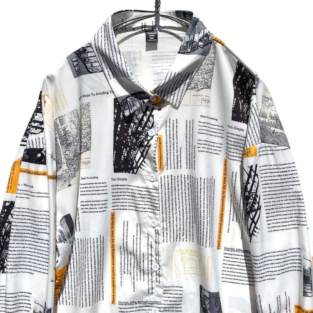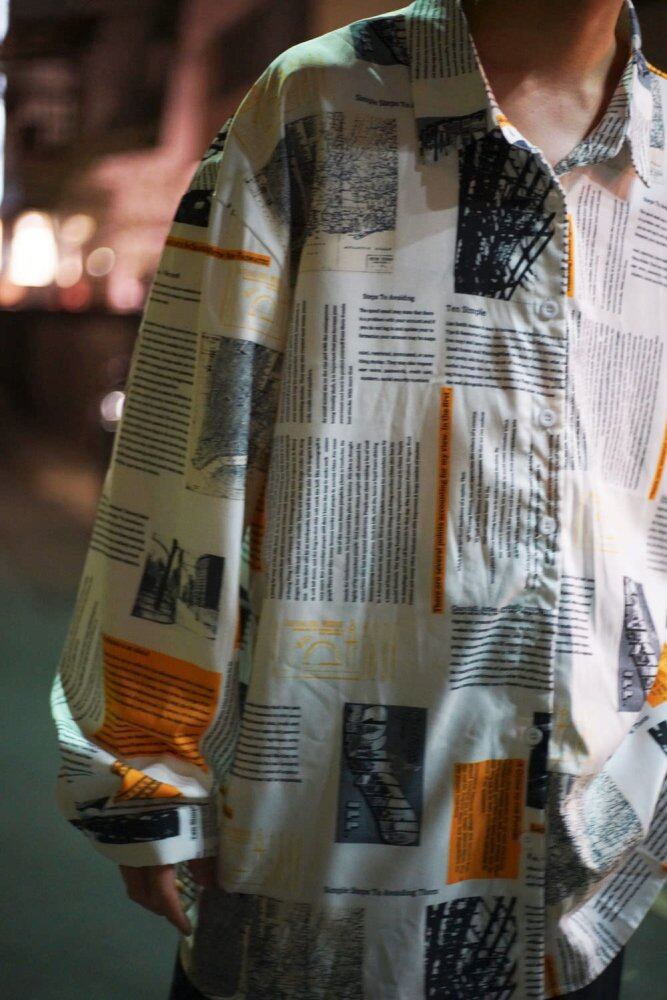 A news paper print shirt from the 1990s with an elegant shiny luster.