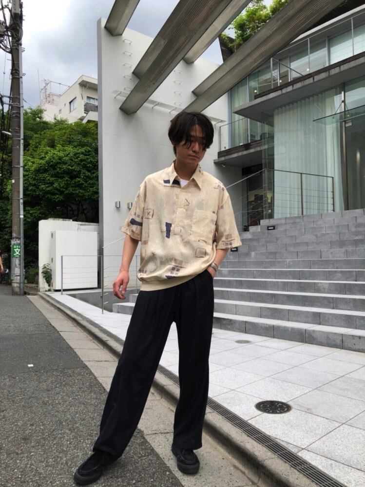80s short sleeve pullover shirt A paisley pattern woven in a glossy pearl beige color, and an elaborate one with a pale art pattern printed on it. 100% luxurious silky touch. Polyester fabric A feeling of over-silhouette that the shoulders fall loosely