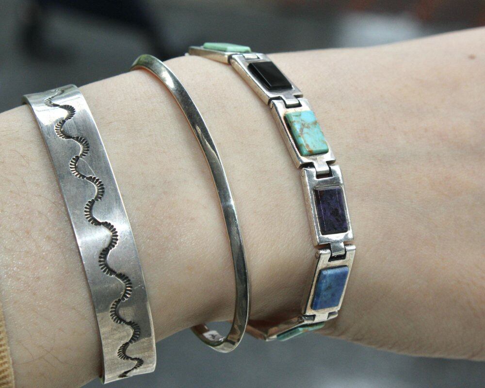 Probably an Italian bracelet from the construction of the safety chain and the hole mark. Designed like a bead bracelet with various gemstones fitted into a sterling body, it is pop and silver, giving it a dignified and casual presence. The fit and flat structure are elegant, and the stones are also elegant. 925 stamp. Since it is old, it may be scratched, so please check the photo and understand the characteristics of vintage before purchasing.