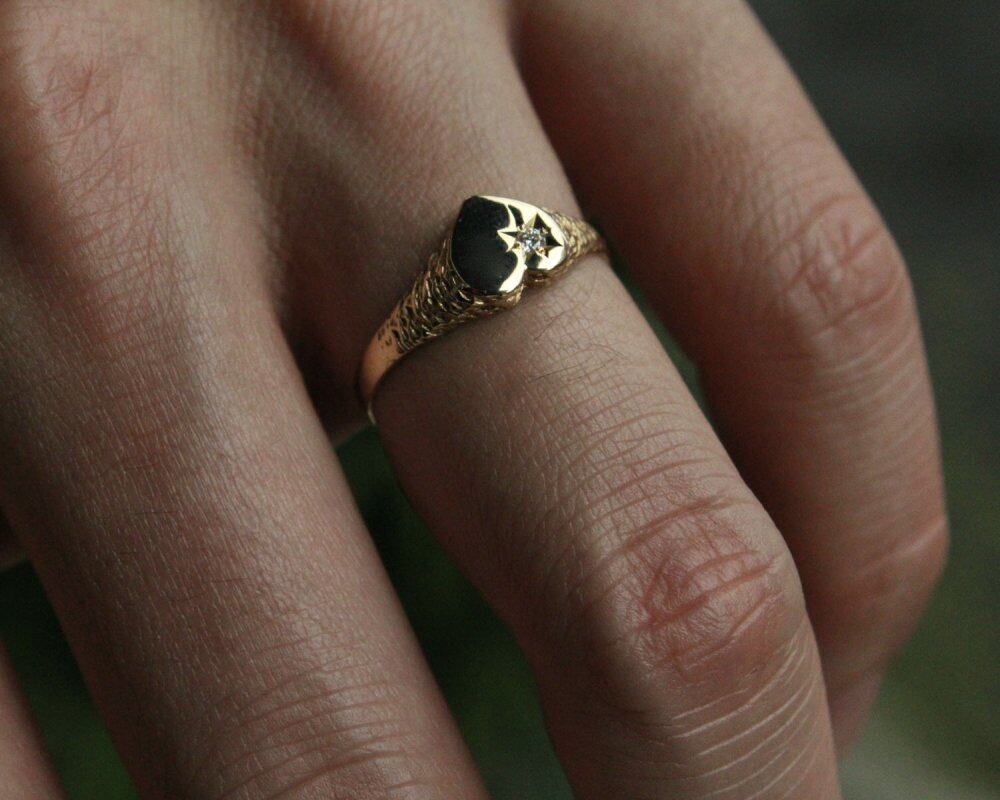 British made signet ring. It is the only ring that is allowed to be worn among British gentlemen who wear good things that can be used for a long time with as little waste as possible. It is a heart motif that can be seen in baby rings, eternity rings, claddagh rings, etc. This is an elegant individual with nugget engraving on the side and diamonds casually inserted. The silhouette is also a simple signet ring type, and it is also a valuable pinky size, so it seems that it can be worn by both men and women. Diamonds are newly replaced at specialty stores for a more elegant shine, 375-9ct gold, Hallmark of the 1984 London office. Please check the condition in the photo and purchase after acknowledging the characteristics of vinteg.