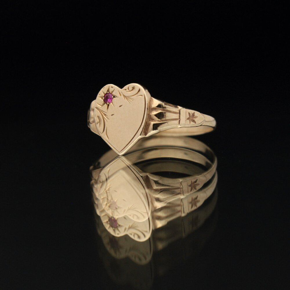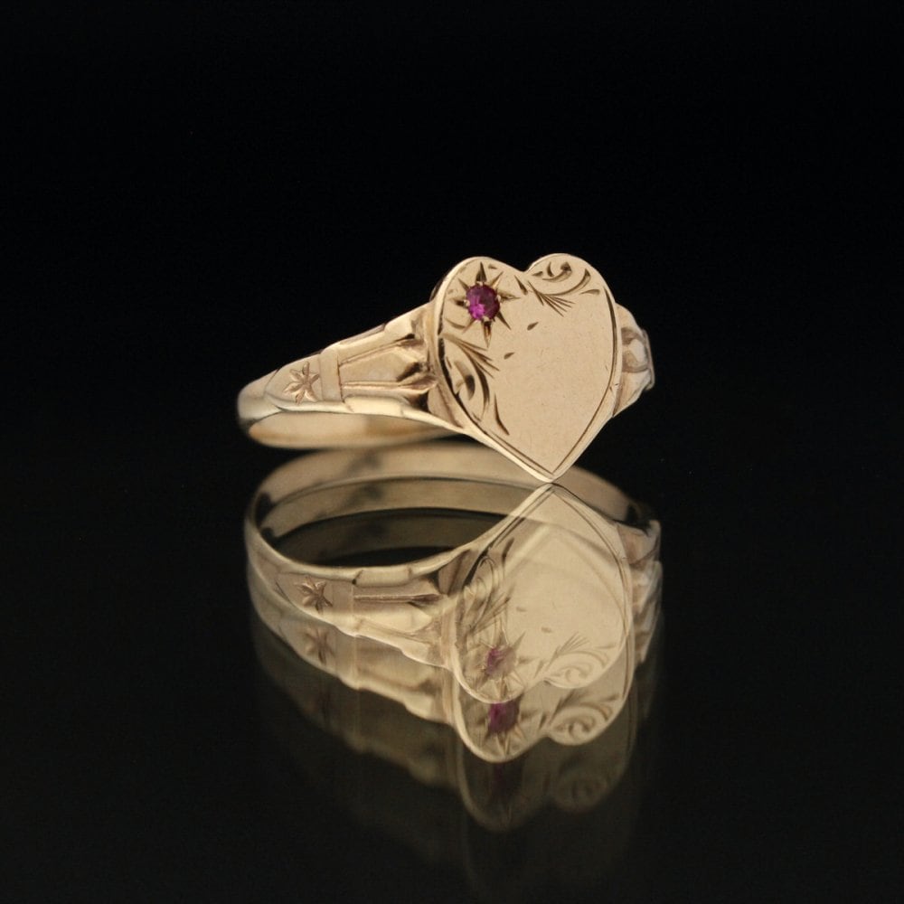 British made signet ring. It is the only ring that is allowed to be worn among British gentlemen who wear good things that can be used for a long time with as little waste as possible. It is a heart motif that can be seen in baby rings, eternity rings, claddagh rings, etc., but this is a rare large heart design, and the engraving that makes you feel the image of Art Deco is also elegant. The point is the casually erotic construction with small rubies. 9ct gold hallmark. Please check the condition in the photo and purchase after acknowledging the characteristics of vinteg.