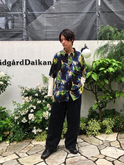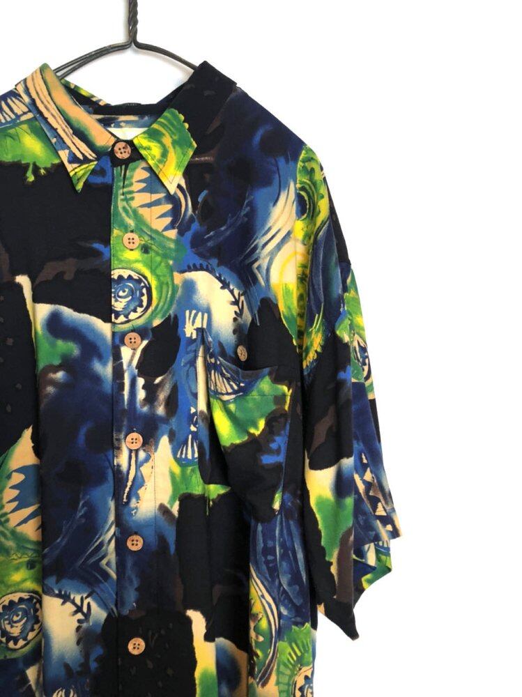 90s short sleeve rayon shirt Black, blue, green abstract art pattern is a cool image 100% rayon fabric that falls softly is a moderately loose and good silhouette vintage shirt with an artistic atmosphere that you want to wear in the summer