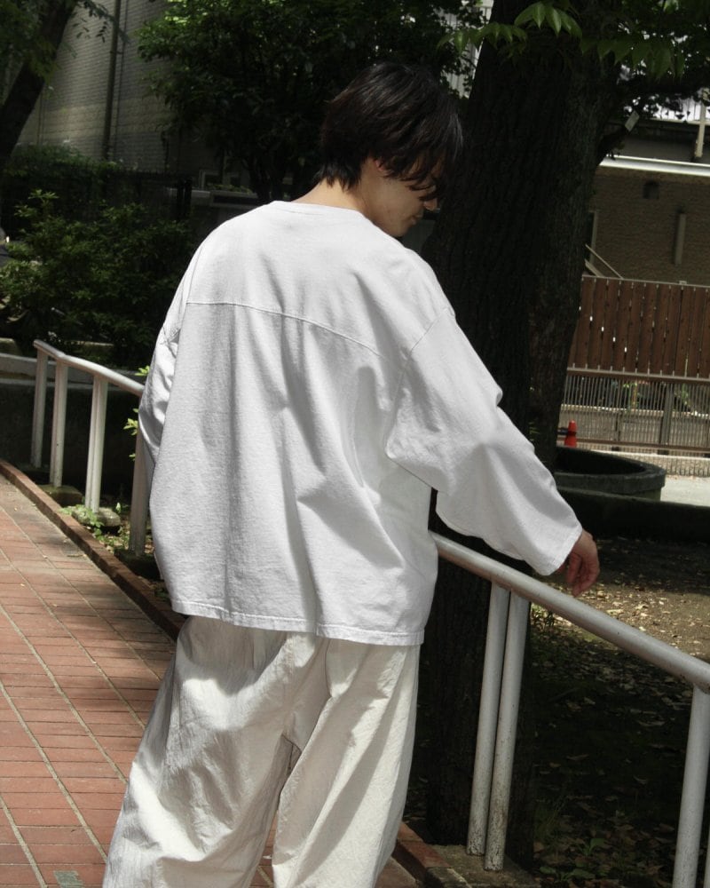 This is a cut-and-sew of our original brand pimpstick remake line. A remake that uses a cotton body with a natural texture and is conscious of vintage American football T. The width of the body is large and there is plenty of space, and both the hem and sleeves are resized to bring a lighter wearing feeling. Hand-dyed, which is our specialty, the light and calm ecru color is finished in an elegant taste. Since it is a remake item, there are some individual differences such as size. As it is a dyed product, discoloration may occur, so it is recommended to wash it alone.