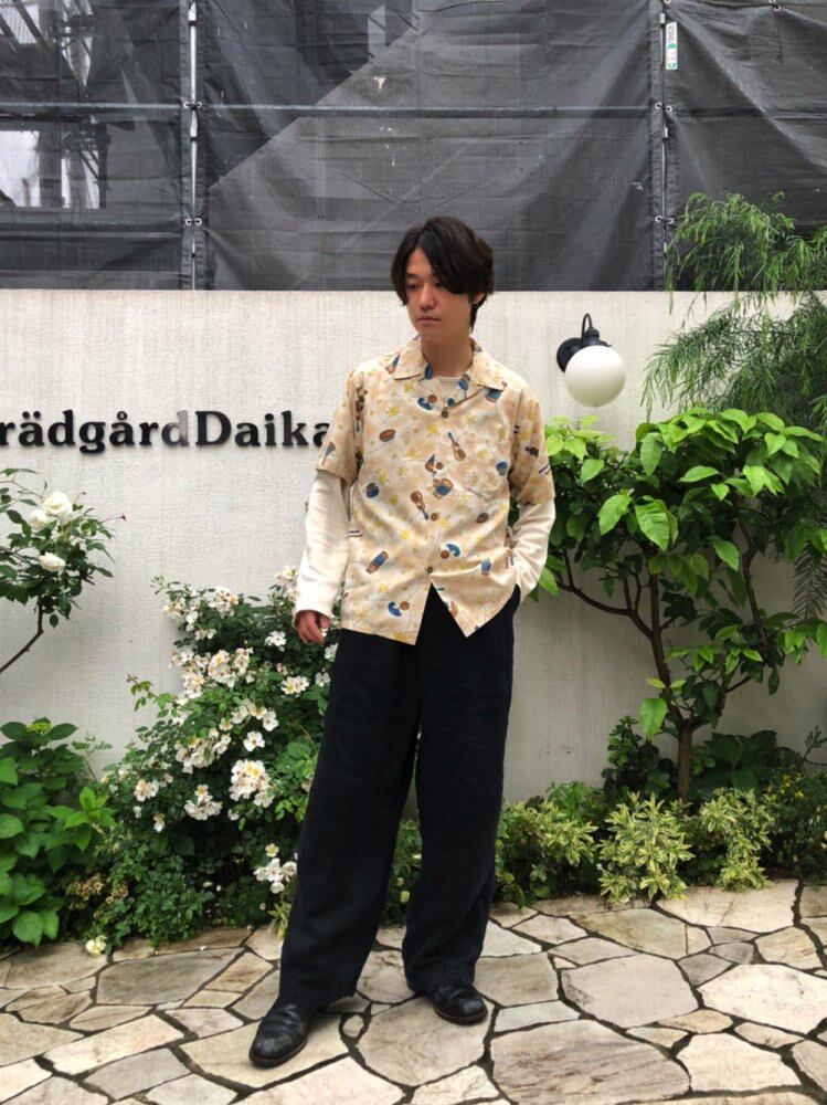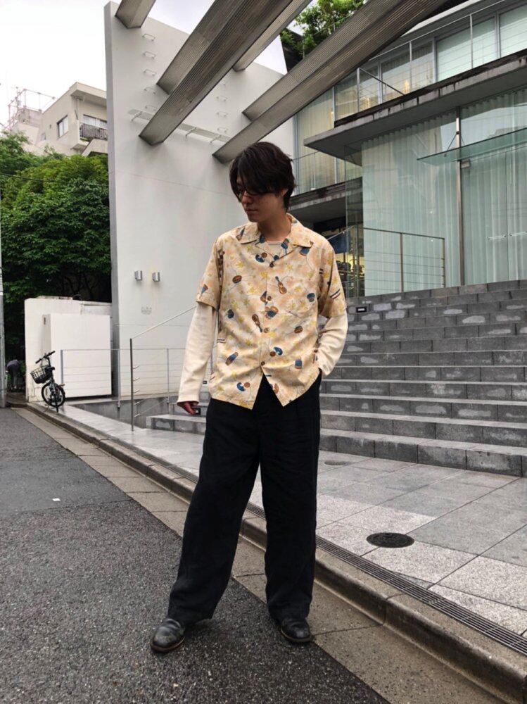 Vintage Aloha shirt from the 1960s A light beige color with a gentle and soft impression of ukulele and flower prints. 100% cotton fabric with a smooth texture that leaves a moderate elasticity. One piece that can be worn with a clean and just silhouette.