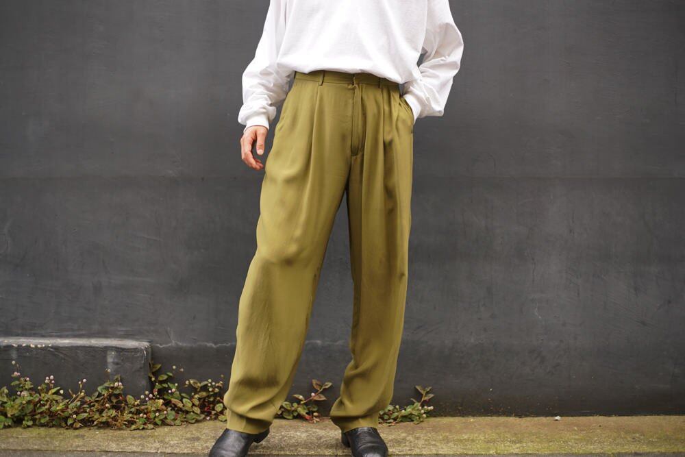 Two-tuck silk trousers from the 1990s with an elegant shiny luster of silk fabric.