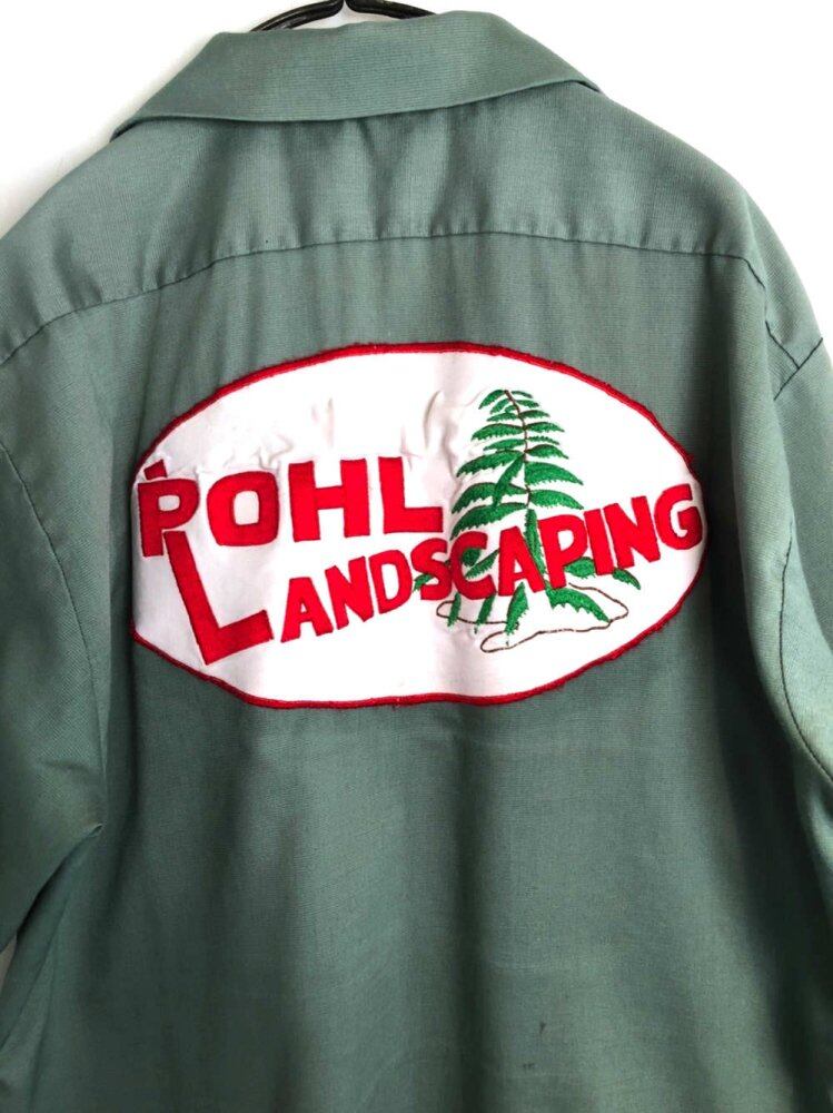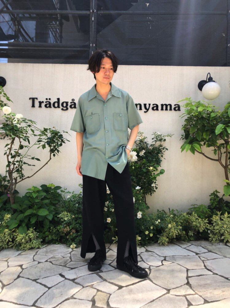 70s short-sleeved work shirt Grayish sage green color is a mature color The big emblem stuck on the back is also a manly piece like vintage workwear. Good size shirt with a moderately loose feel
