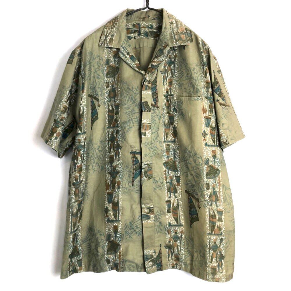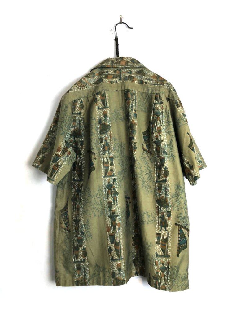 Vintage Aloha shirt from the 70s The pattern of ancient Hawaiian warriors printed in a moderately decolored olive color is a nice piece of clothing. 100% cotton fabric with a smooth and smooth feel. 1 piece of