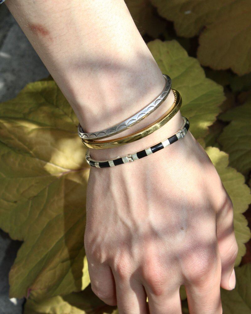 * This item will be shipped assorted. Please note that the size, silhouette and stamp design may differ slightly. A work by Navajo female artist ERICK A NICOLAS BEGAY. All of her works use handmade ingot silver, giving off a presence that sets it apart from modern machine-produced Navajo jewelry, and because the plate making is also particular about handmade, there is no one that is the same. Each item is unique and unique. Inspired by the Fred Harvey style that has been around since the 1800s, her work is different from the heavy and profound Navajo jewelry, with a delicate and delicate atmosphere and a stylish yet handmade texture. This is a minimal plain square type that is made of brass and has a beautiful gold tone. Compared to gold, the contrast is very beautiful when combined with silver products without being overly assertive. S size is female size, M size is mens size (slender men are S size). Since it is handmade, there may be scratches, so please check the photo and understand the characteristics of vintage before purchasing.