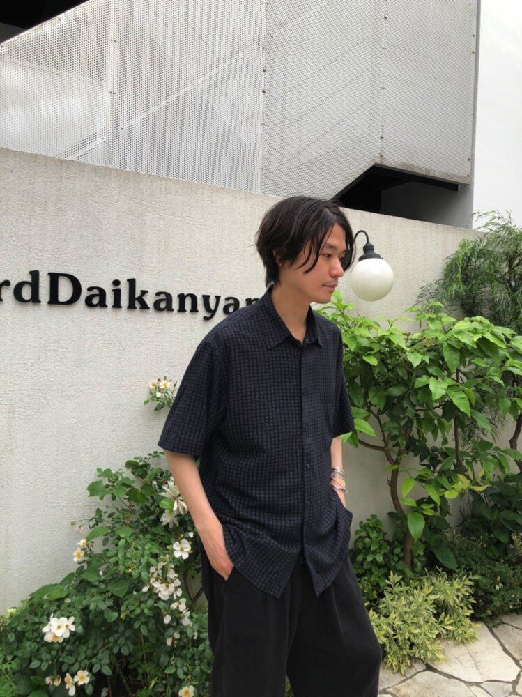 90s short-sleeved shirt Silk x rayon with a smooth-falling texture, a soft and comfortable one. Black x purple cool graph check.