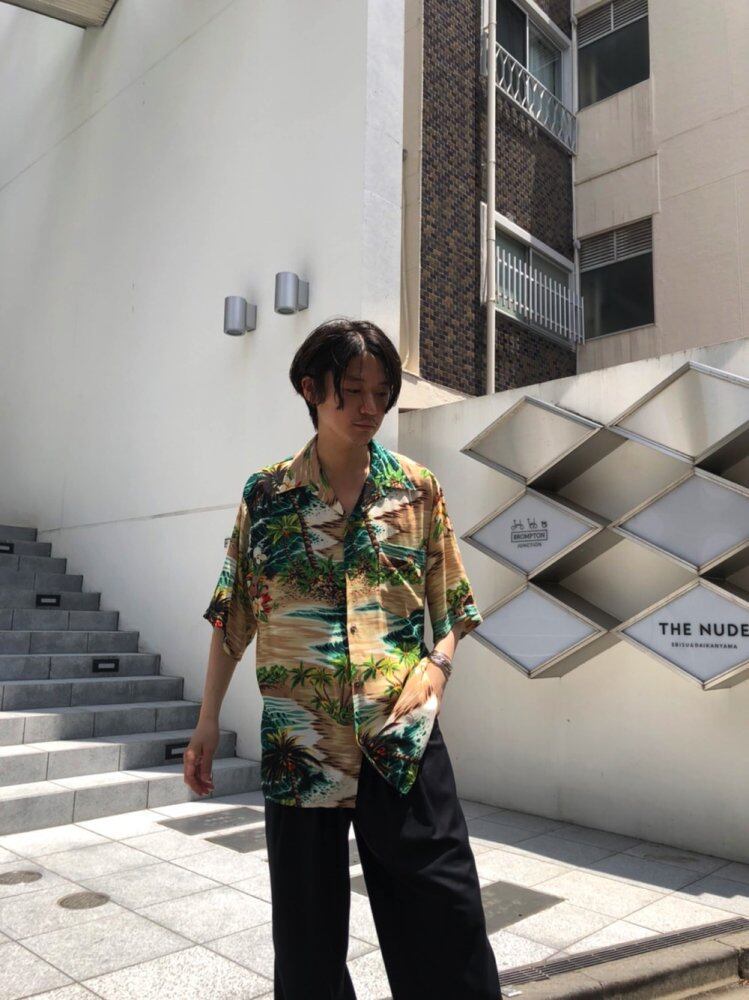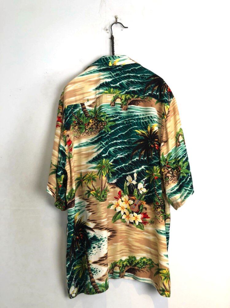 The smooth touch of 100% rayon material and the cool drape that flutters in the wind are perfect for summer. The classic Hawaiian pattern based on beige and green is a royal Hawaiian shirt. A relaxing silhouette with plenty of space.