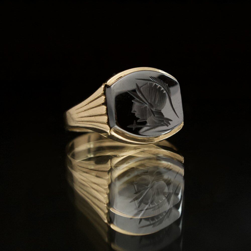 The precious mens cameo ring and the Roman knight are dug, and the design is seemingly different from the image of a feminine cameo coming and going. The top is hematite, which is characterized by chrome black, which is often used in cameo rings, and is also called a substitute stone, and is said to have the power to ward off danger and disaster and bring victory. This is a rare top design that is close to an oval shape, and has a simple and elegant appearance. Engraved with 375 9 carat gold, Hallmark of the 1989 London Assay Office. Please check the condition in the photo and purchase after understanding the characteristics of vintage.