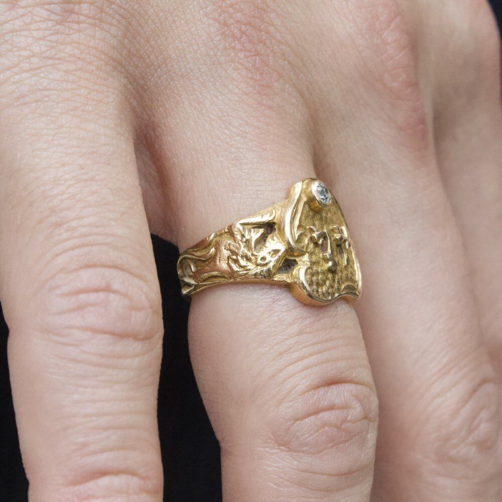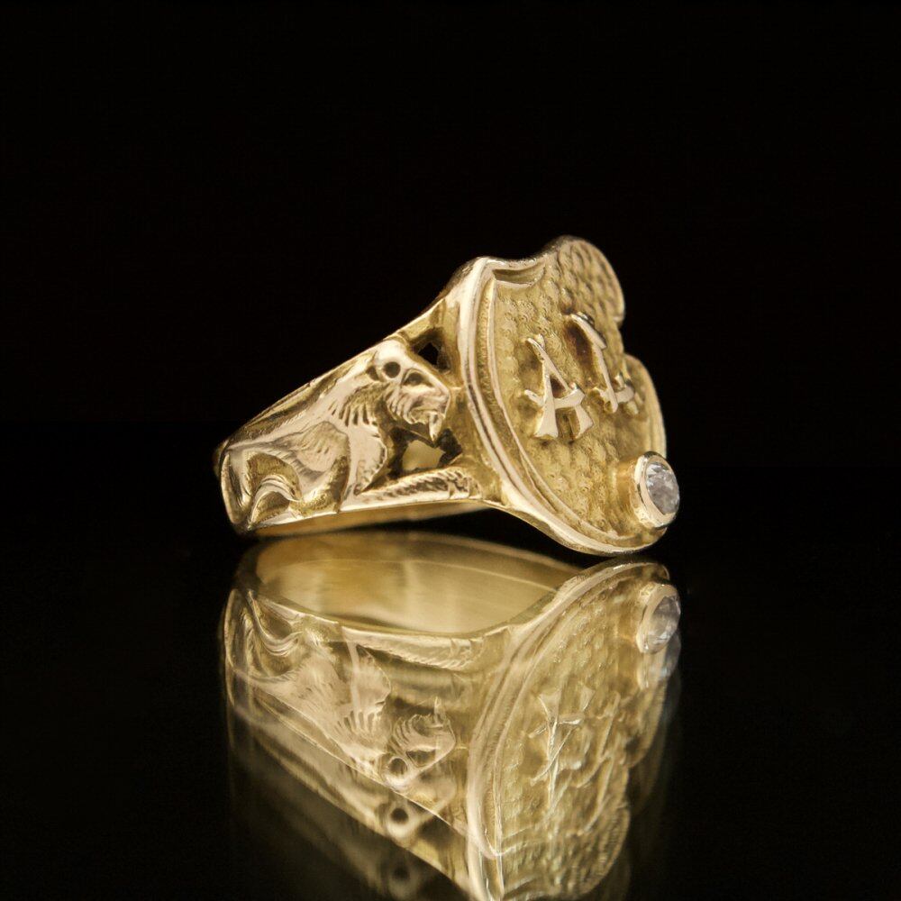 The style of Queen Victorias reign (1837-1901) is called Victorian, and antiques of this age are still very popular due to the remarkable development of art. It was used in architectural design as a symbol of the lion that was popular in this age, and as a mannish symbol that made it look loyal. This is a design with male and female lions lined up on the side, which may be meaningful as a wedding ring or a gift. Unique top design such as initial font design, finely dug pattern, silhouette, etc. that can be seen in Memento Mori Ring, 14k Gold engraving, yellow gold body itself is heavy and carat numbered diamonds are also cut High quality can be seen from the brilliance. Please check the condition in the photo and purchase after acknowledging the characteristics of vinteg.