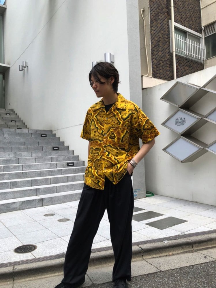 Vintage Aloha shirt from the 70s Yellow x brown nostalgic shade with a map of the Hawaiian Islands printed on it. One of the silhouettes