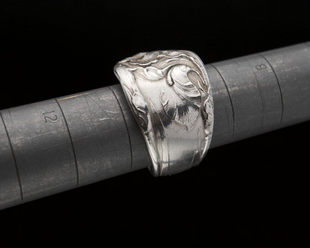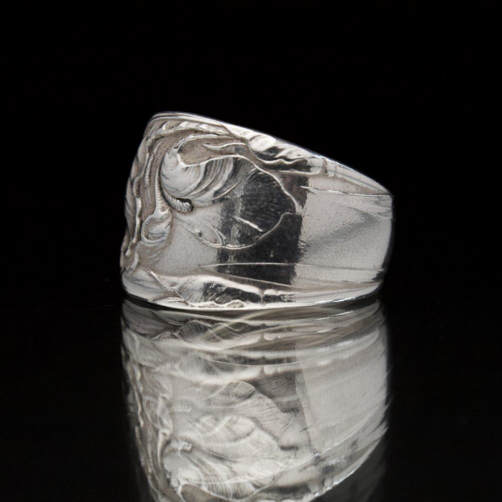 Spoon rings are said to have started around the 17th century when aristocratic servants couldnt buy wedding rings and stole their masters cutlery. Hippies have discovered it since the 1960s and have revived it again. Most of them are from the long-established American silver tableware makers that started in the 19th century, and I dont know the makers because the hallmark part is not used, but it seems to be a vintage from the 1930s to the 1960s from the detailed design. It has a solid and solid body, a simple and elegant appearance with a leaf pattern. The engraved part is not used, but it is Sterling Silver. Because it is a vintage item, there are threads and scratches. Please check the photos and understand the characteristics of vintage and antique before purchasing.
