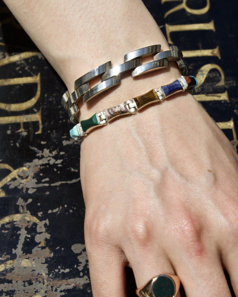 Made in Taxco, Mexico, one of the worlds leading silver mining sites, where many silver artists and craftsmen have gathered since ancient times. From the native Aztecs to the Native American jewelry-like designs that show the influence of the Southwestern United States, and the sophisticated minimalist designs of Scandinavia, this vintage has evolved uniquely in recent years. Designed like a bead bracelet with various gemstones fitted into a sterling body, it is pop and silver, giving it a dignified and casual presence. This is an elegant piece with a square-shaped shape and a dynamic design, and the atmosphere of the ore is also good. Higher purity 950 silver, Mexico-Taxco engraving. Since it is old, it may be scratched, so please check the photo and understand the characteristics of vintage before purchasing.