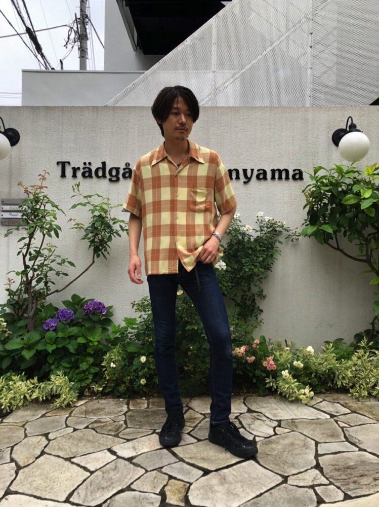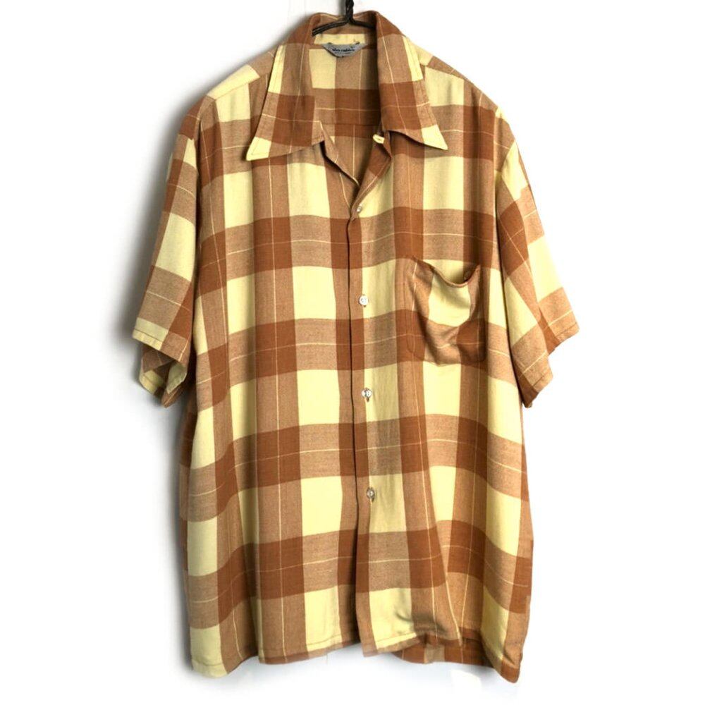 70s short sleeve rayon shirt A soft cream color with a light brown check is a gentle image. It is one of 100% rayon materials that is soft to the touch.