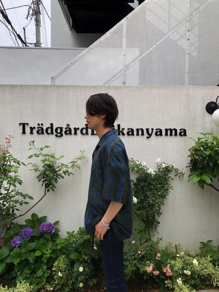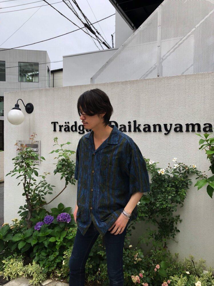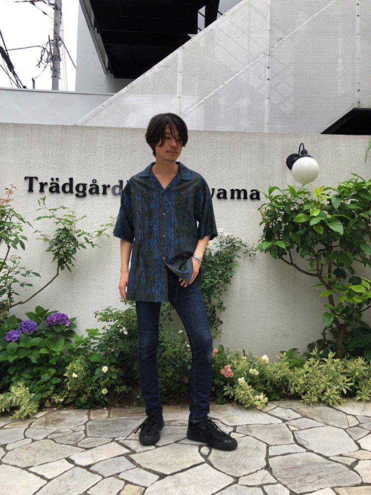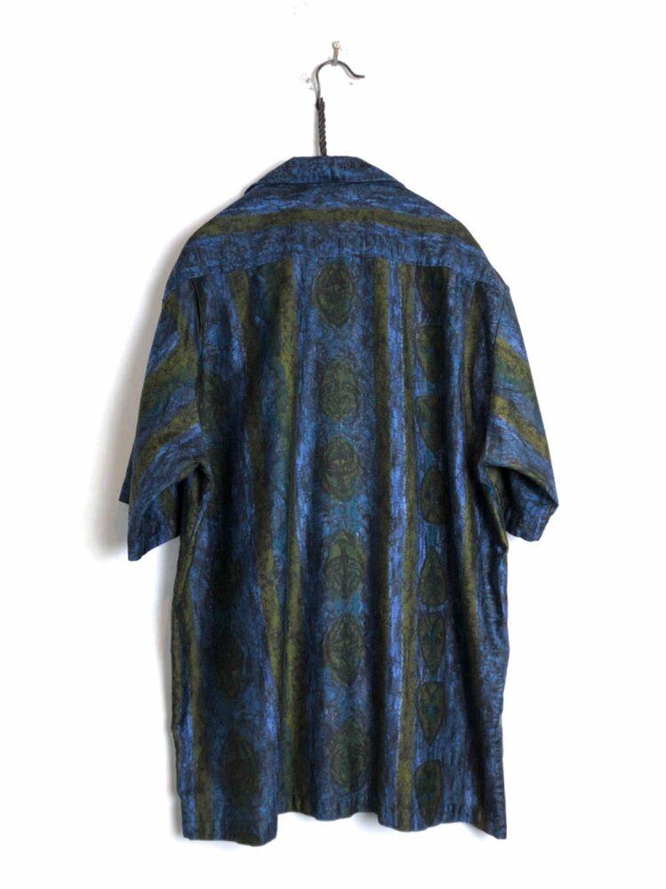 60s Vintage Aloha Shirt A cool piece with Hawaiian Tiki printed on the cool dark tone of blue and khaki Cotton satin fabric with a slightly glossy and smooth texture. It is one of the XL size