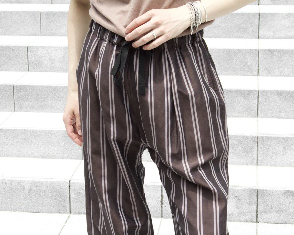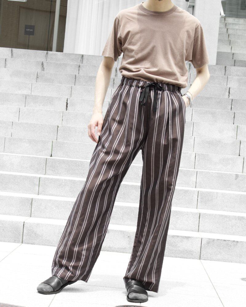 [ALVISTA] 4th Issue. Sleeping pants made simply using the brands archive stock fabric. The waist is tucked to give it a beautiful look like Trousers, with rubber shirring and drawcord easy pants. The tapered silhouette with a moderate amount of space throughout makes it very easy to wear with a versatile FREE size setting regardless of the wearers body shape or style. The material is made of cupra, linen, and cotton with a smooth striped satin fabric that makes it easier to wear in the spring and summer.