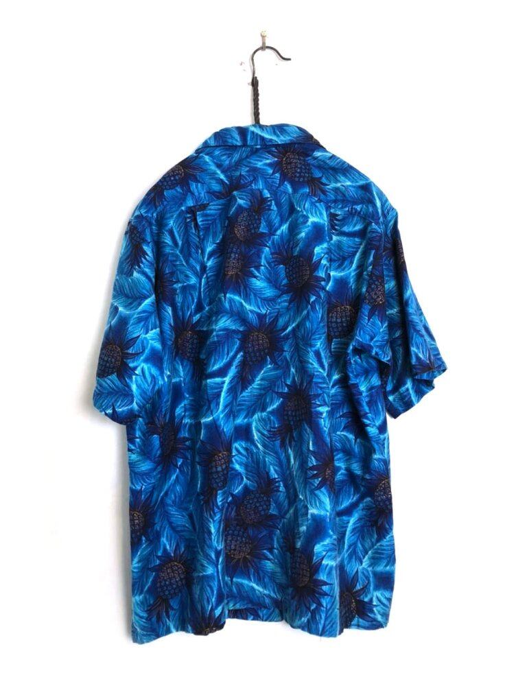 Vintage Aloha Shirt from the 1960s A piece of cool blue with leaf and pineapple printed on it. 100% cotton fabric with a smooth texture and a nice touch.