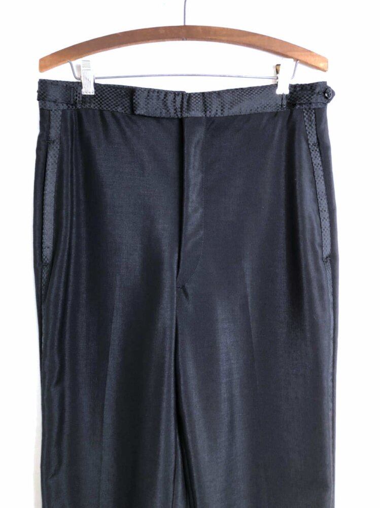 80s black tie trousers A clean tapered silhouette with a moderate amount of space. Summer wool fabric with a smooth texture and glossy summer wool fabric. Block check fabric is used for the side lines. One piece, waist size can be adjusted from 76 cm to 80 cm