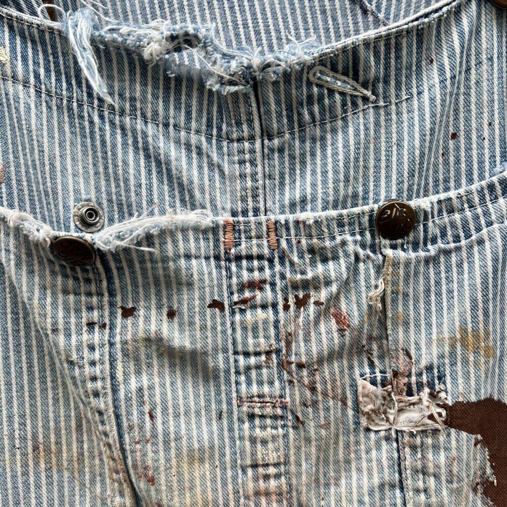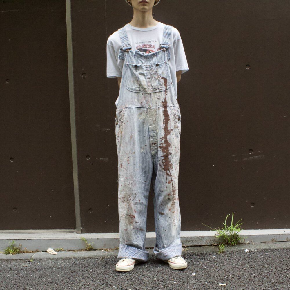 Hickory striped overalls made by BICMAC around the 1970s. I cant find many standard items that have been so realistically aged. The fabric has become softer over time, giving it a light texture, and the paint marks scattered on the hickory striped body give it an artistic look. Probably 38 size, it is a silhouette that looks neat. Quality: Cotton Color: Striped SIZE: Unknown [Size] Placket: 25,5cm W & inch: 94cm (37,0inc) Hips: 56,5cm Length: 37cm Rise: 36cm Inseam: 77cm Hem width: 26,5cm [Model size] Height: 170cm Shoulder width: 40cm B (chest circumference): 80cm W (waist): 70cm Since it is an old item, it may deteriorate over time. We try to make the product photos as close to the actual color as possible, but the color may differ from the actual product depending on your monitor settings, room lighting, etc. Please check the photos and understand the characteristics of Vintage before purchasing. * Please refer to here for the measuring method.