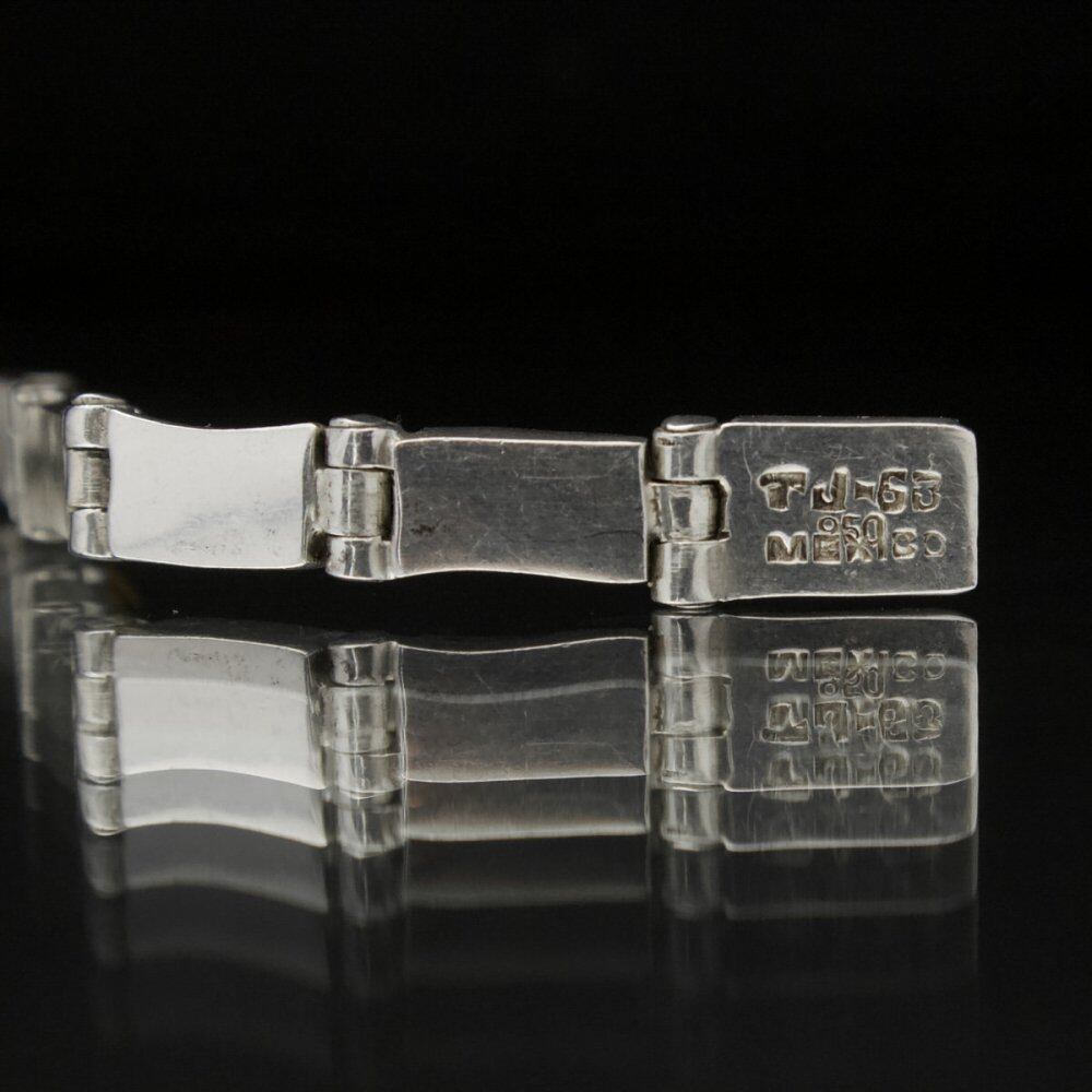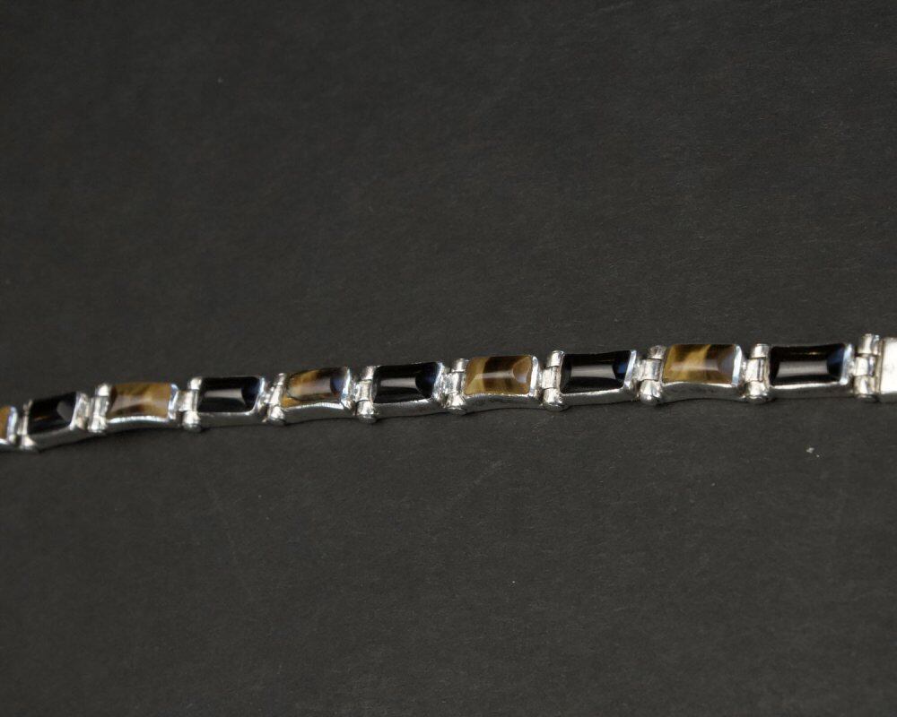 Made in Taxco, Mexico, one of the worlds leading silver mining sites, where many silver artists and craftsmen have gathered since ancient times. From the native Aztecs to the Native American jewelry-like designs that show the influence of the Southwestern United States, and the sophisticated minimalist designs of Scandinavia, this vintage has evolved uniquely in recent years. Designed like a bead bracelet with various gemstones fitted into a sterling body, it is pop and silver, giving it a dignified and casual presence. This is a square type, narrow silhouette and a solid design with onyx and tiger eye. Higher purity 950 silver, Mexico-Taxco engraving. Since it is old, it may be scratched, so please check the photo and understand the characteristics of vintage before purchasing.