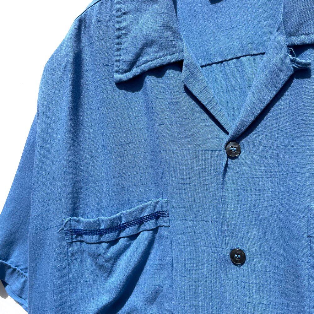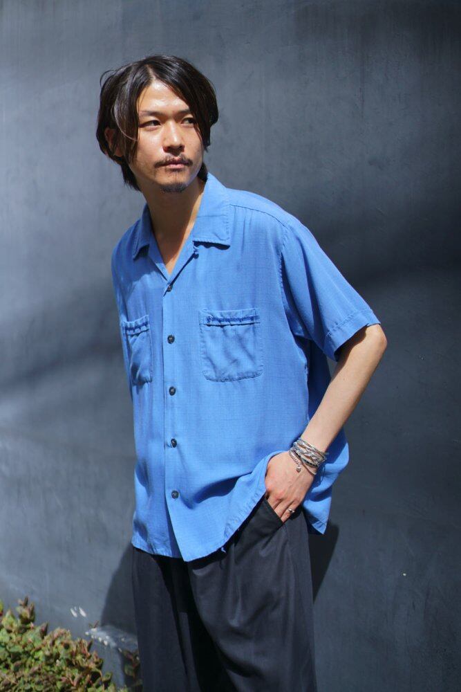 A saxophone blue body with a dull tone unique to vintage, a design with emblem embroidery on the chest, a 50s Kasuri pattern is applied to the whole, and while following the vintage style, there is a jazzy atmosphere like Da Vinci. It features a sophisticated design.