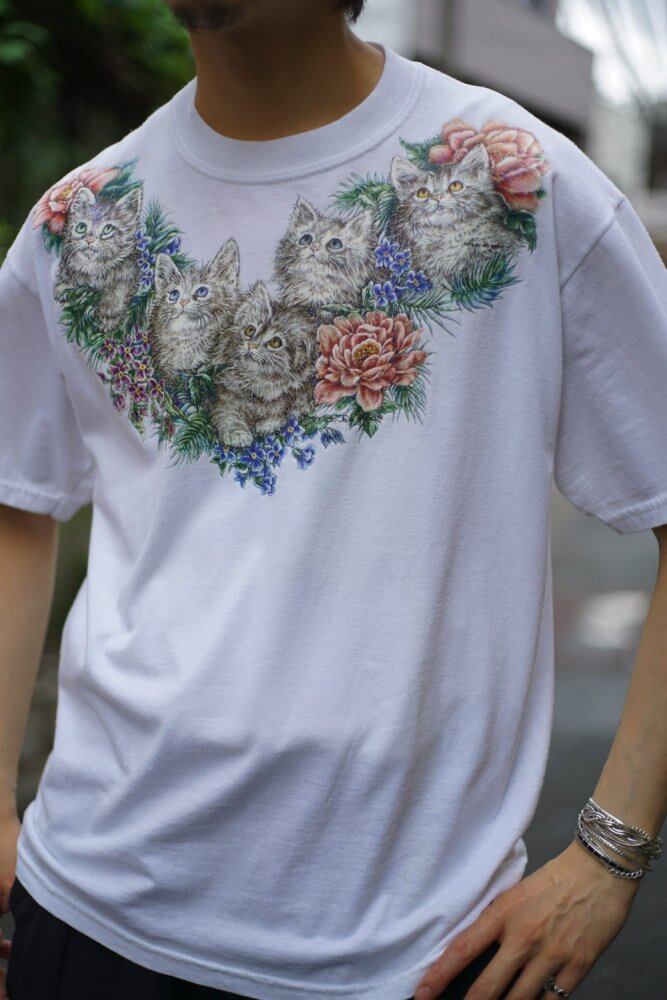 Vintage cat print T-shirt.<BR> Cute artwork with floral prints and kitten prints.