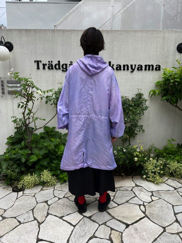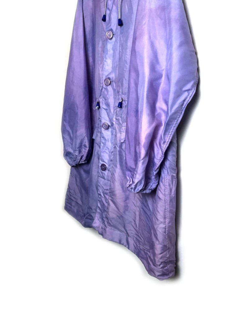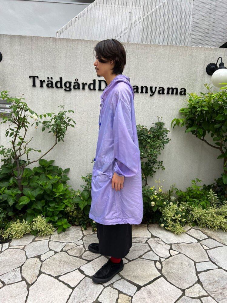 Introducing a new item from Nishizome. A thin and very light polyester hoodie made by hand-dying a vintage snow camouflage hoodie from the Dutch army. It is the first item that can be used as a bag for outdoor activities such as festivals. This color is a hydrangea-like color that is a mixture of blue and pink in pale purple. It is a vintage military item that you can wear without