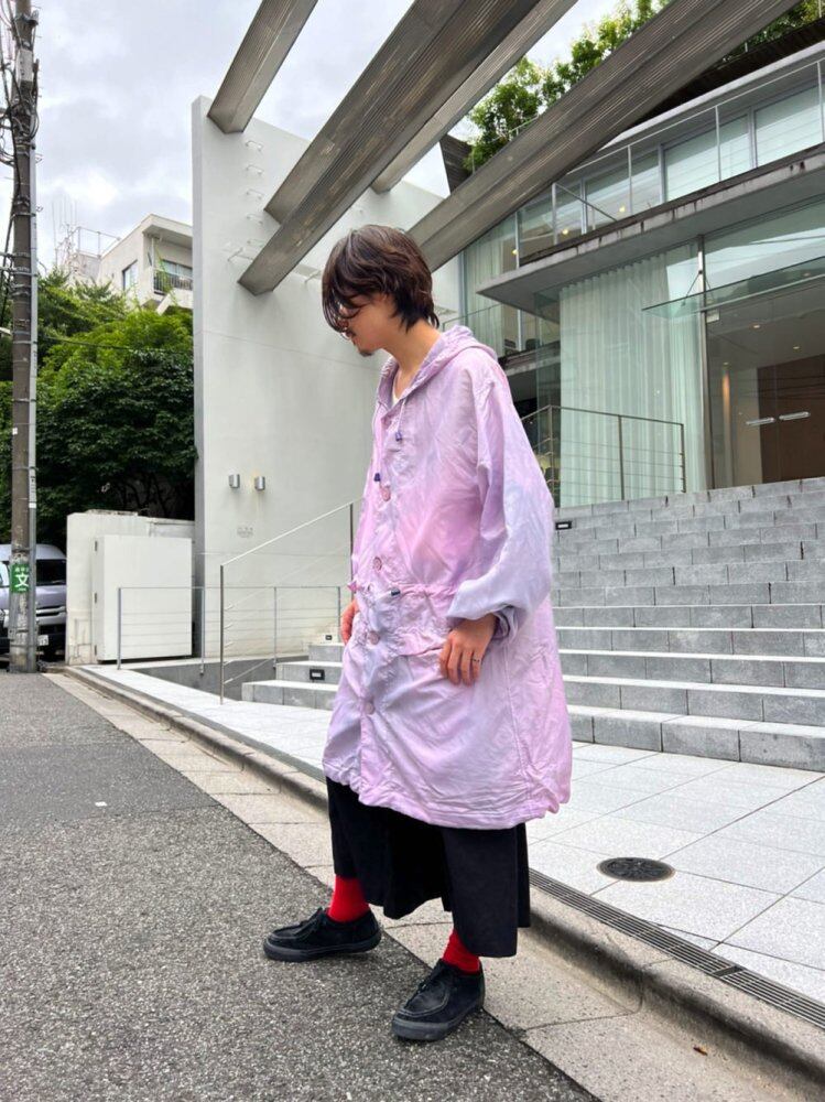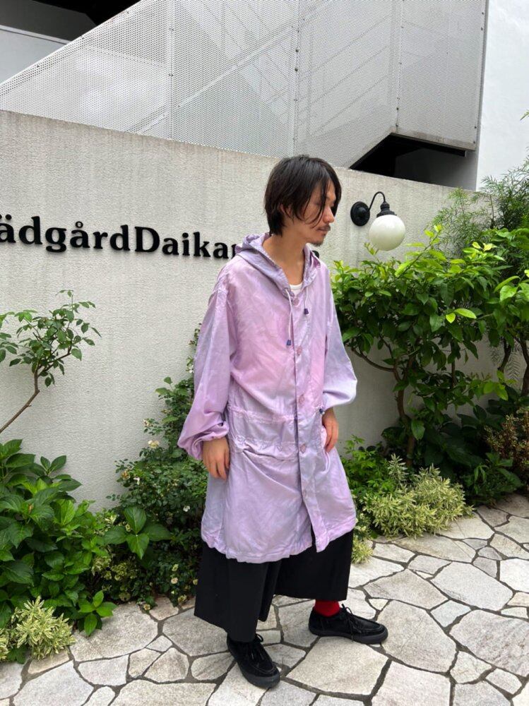 Introducing the new Nishi-dye item. A thin and very light polyester hoodie made by hand-dying the Dutch armys vintage snow camouflage hoodie. It is the first item that can be used as a bag for outdoor activities such as festivals. This color is a light pink color with a shadow-like gray color that is easy to match. It is a vintage military item that you can do