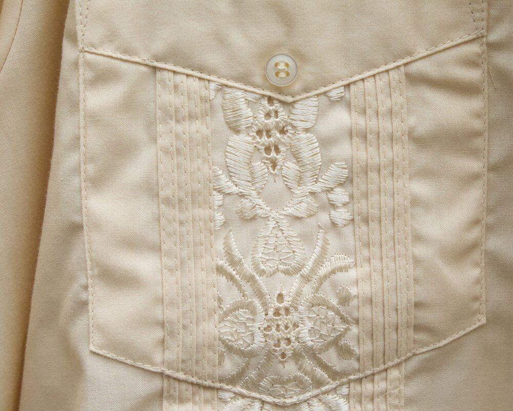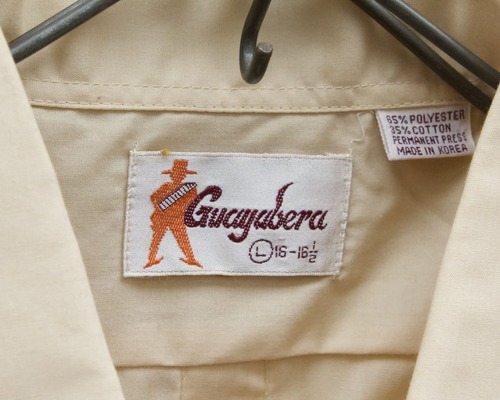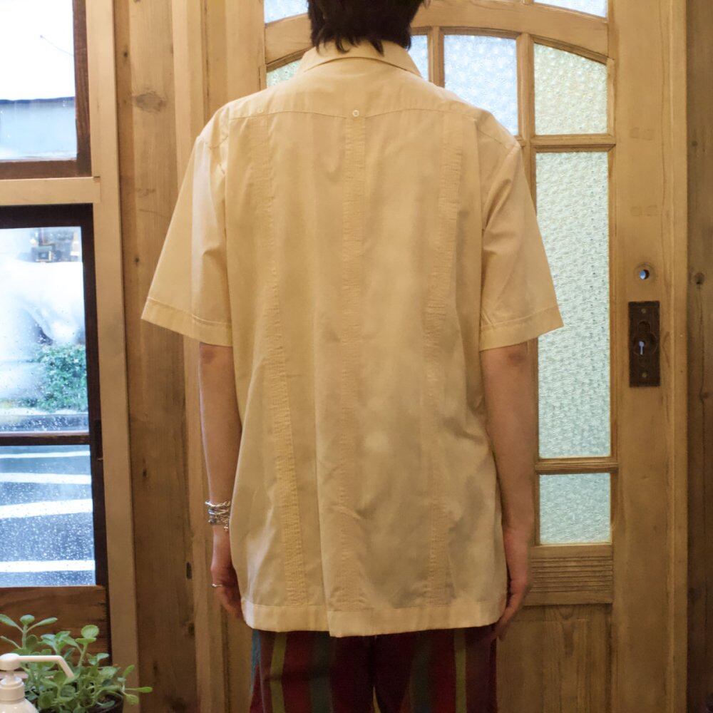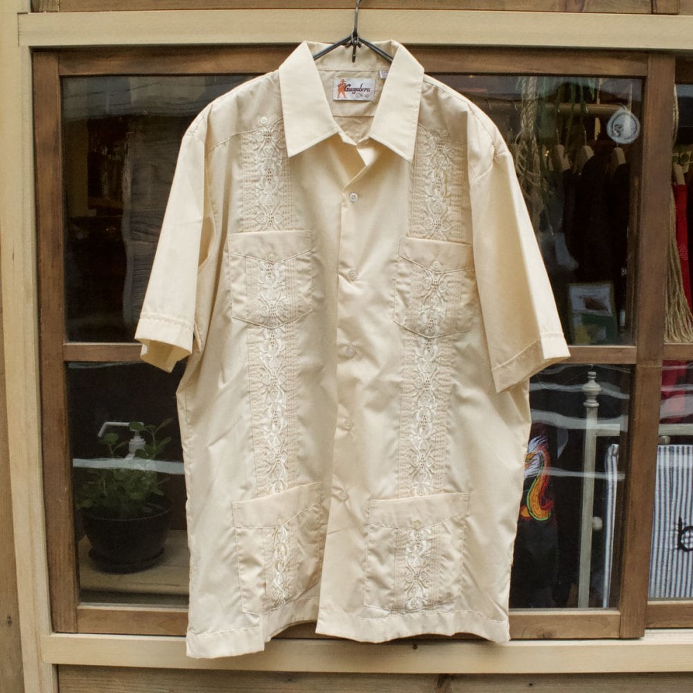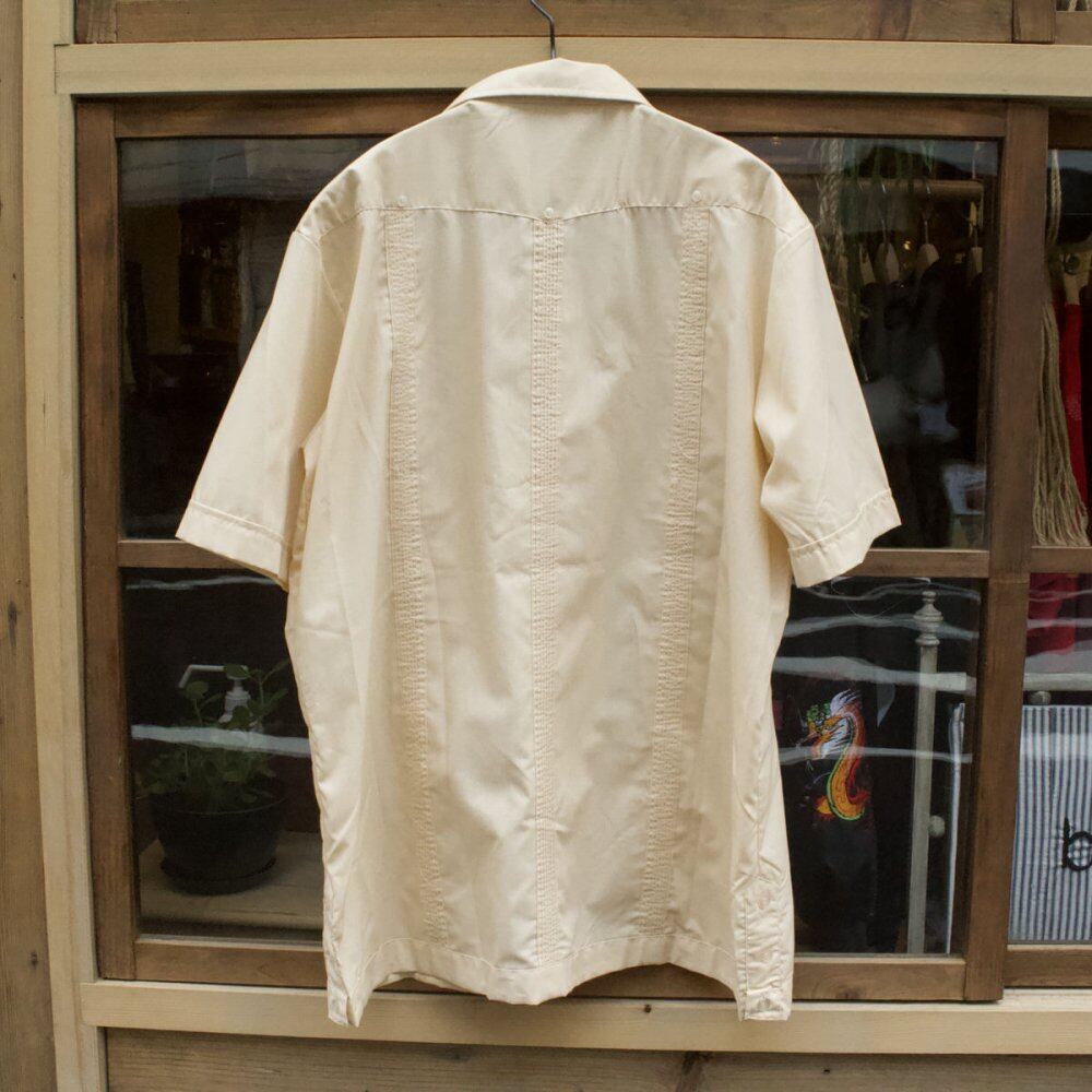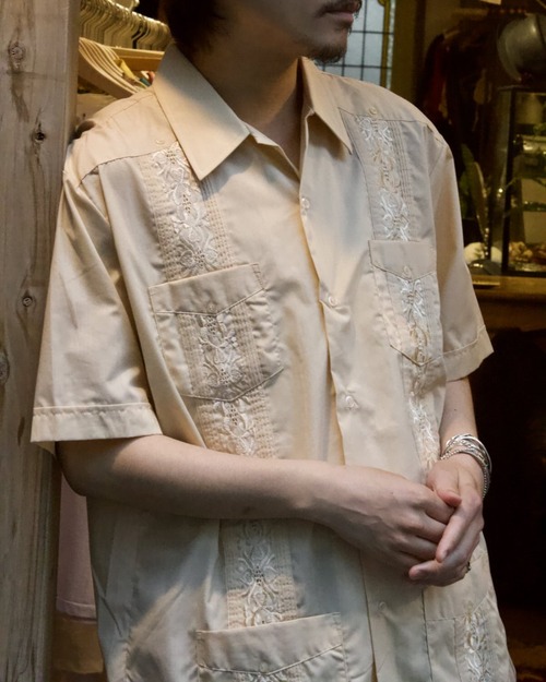 A precious old Cuban shirt. In the book, it is called a Cuban shirt, but in South America it is called guayabera, and its origin is uncertain, such as the theory of Filipino origin and the Cuban origin theory that uses a large number of pockets to store cigars. Used as a formal shirt in Cuba, the open collar has a box silhouette and embroidery that gives a dressy impression contrary to the mannish work style with many pockets, which is the unique fun and popularity of this item. Isnt it a factor? It features a soft and refreshing texture with cotton / polyester specifications, and has a clean silhouette that looks good with dead stock. Quality: Cotton 35% Polyester 65% Color: Beige SIZE: 16 --L [Size] Shoulder width: 50cm Width: 59cm Sleeve length: 26.5cm Length: 77cm [Model size] Height: 175cm Shoulder width: 43cm B (chest circumference): 85cm W ( Waist): 71cm Since it is old, it rarely deteriorates over time. We try to make the product photos as close to the actual color as possible, but the color may differ from the actual product depending on your monitor settings, room lighting, etc. Please check the photos and understand the characteristics of Vintage before purchasing. * Please refer to here for the measuring method.