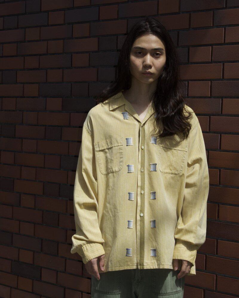 An open collar shirt from the 1960s. The cotton fabric, which is lighter and more supple over time, has fine stripes for a deep look. The front embroidery and the specifications of the Kasuri edge are more astringent, and it is a design that seems to be of this age. A rare L size with a loose silhouette. Mainly damage to the collar. Quality: Cotton Color: Dull YEL SIZE: L [Size] Shoulder width: 50.5cm Width: 63cm Sleeve length: 61cm Length: 71cm [Model size] Height: 170cm Shoulder width: 40cm B (chest circumference): 80cm W (waist): 70cm Old Therefore, it rarely deteriorates over time. We try to make the product photos as close to the actual colors as possible, but the colors may differ from the actual products depending on your monitor settings, room lighting, etc. Please check the photo and understand the characteristics of Vintage before purchasing. * Please refer to here for the measuring method.