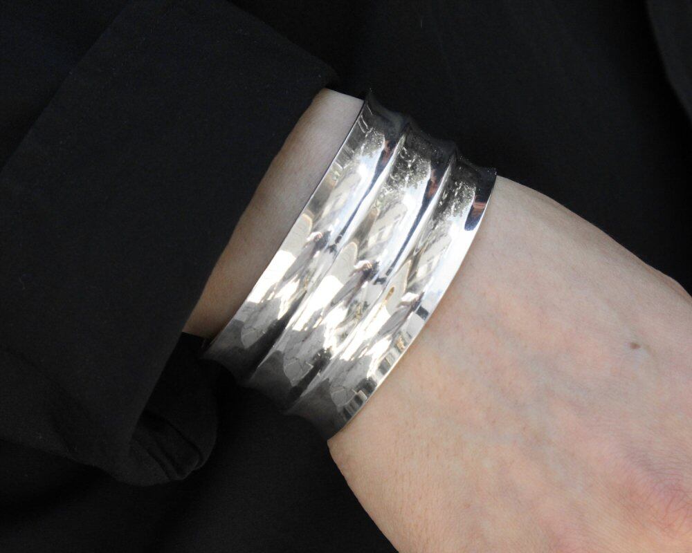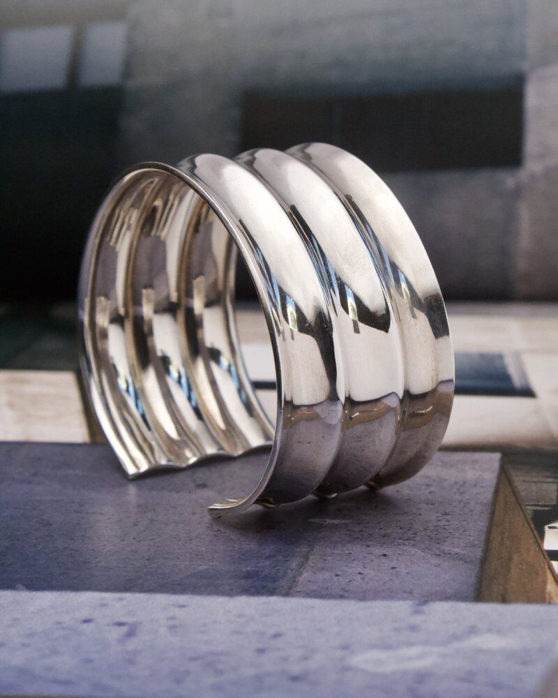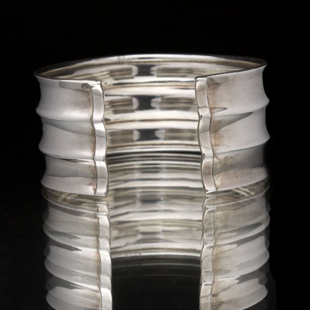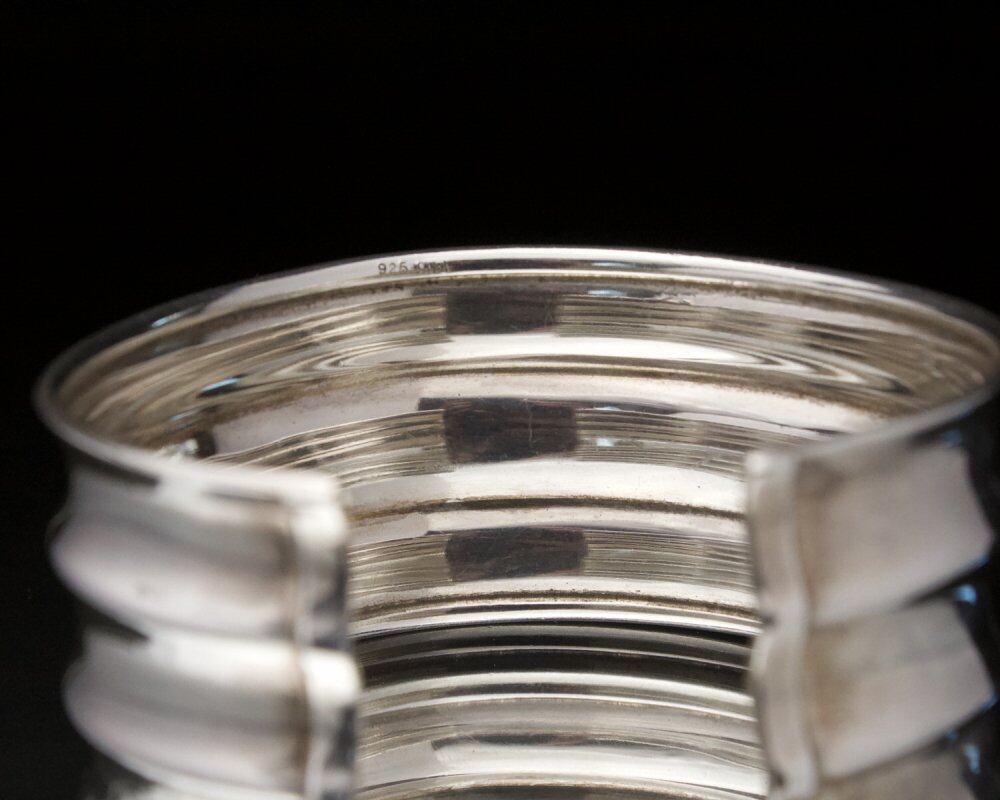 A precious minimal and wide silhouette silver bangle. It can be used as an armlet because it is firm but not too heavy. Probably made by an American jewelry brand around the 1980s. 925 stamp. Since it is not so hard, it is possible to adjust (squeeze) the size slightly. Please check the condition in the photo and purchase after acknowledging the characteristics of vinteg.