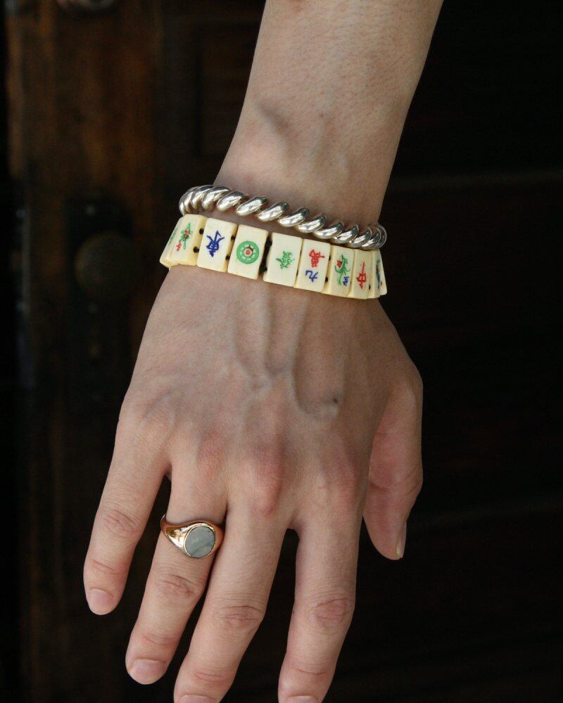 Vintage bracelet with mahjong tiles. Made of animal bones, it has a soft and natural texture. The design is a series of mahjong tiles, and it is probably a gambling amulet or a souvenir item, but it has a charming look. The small tiles are casually used, and the pop printing also enhances the retro atmosphere overall. The rubber specifications make it easy to put on and take off, and it feels light to wear. Please check the photos and understand the characteristics of vintage before purchasing.