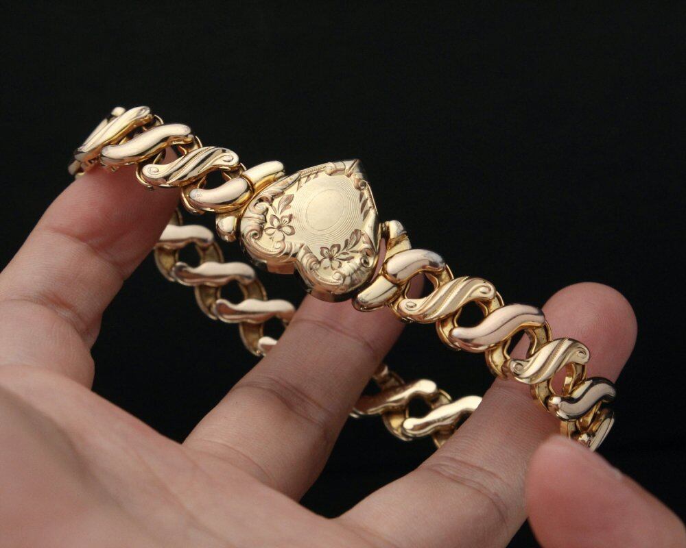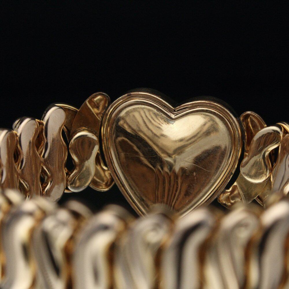 From the early 1900s to World War II, this item was given as a gift by couples during the war. The elastic bellows mechanism bracelet, which is not made today, provides a moderate fit and is thickly gold-plated, and its gorgeous and delicate construction creates a vintage-like dignity and luxury atmosphere. Made by Spiidel, a long-established company that started in the 19th century, the heart-shaped top has a delicate engraving that gives it an antique look. Since it is old, there are dullness over time and fine scratches. Please check the photos and understand the characteristics of vintage before purchasing.