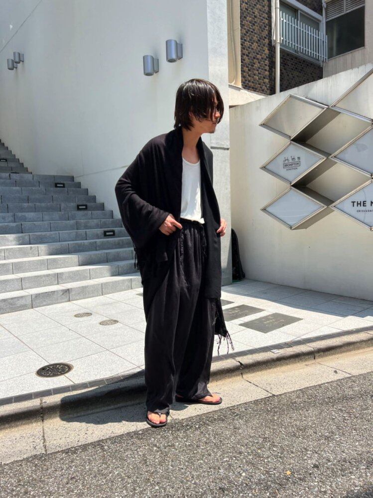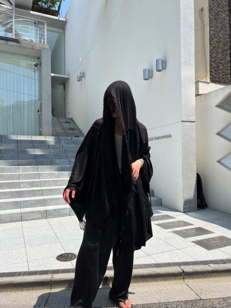 “Introduction of new remake items from the pimpstick remake line. Vintage rayon stoles are spliced together and remade into a single large shawl. You can wear it like a poncho or make it a voluminous roll. The color is black.