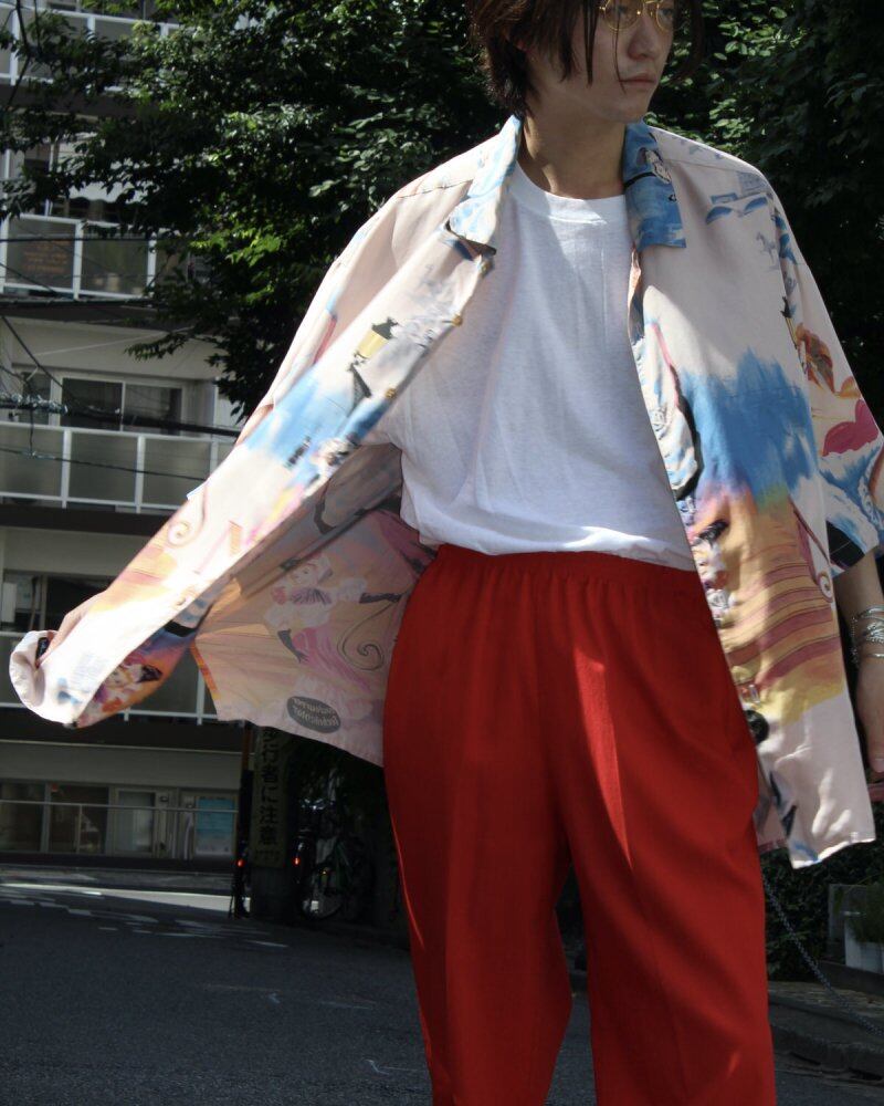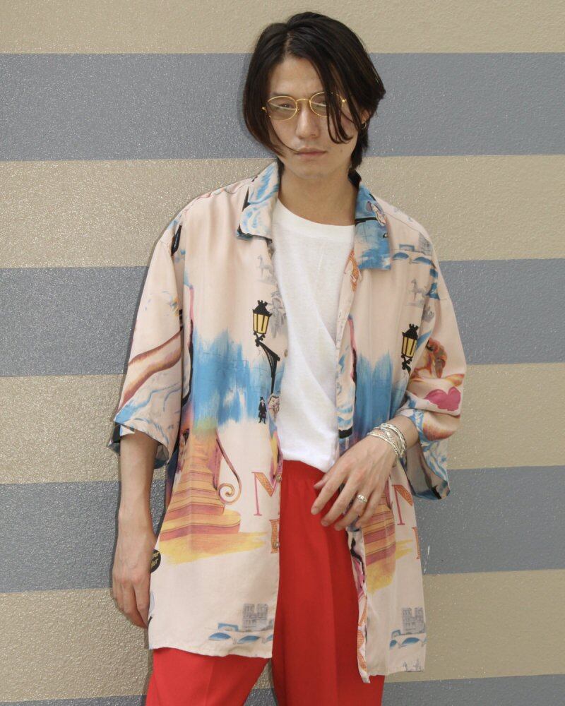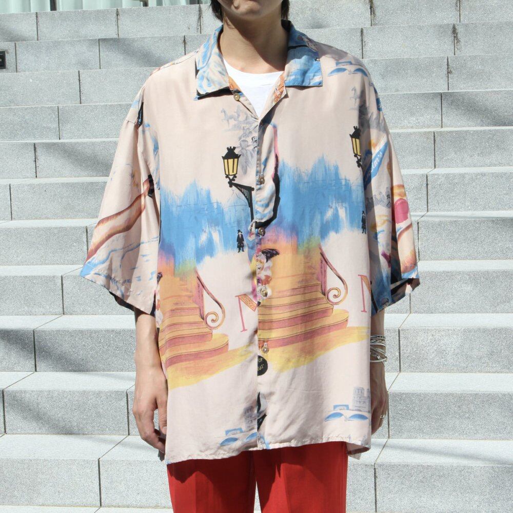 A very rare piece among the patterned shirts of the 1980s with the Parisian cabaret Moulin Rouge print. The edgy design on the light pink body gives an impactful impression. Light 100% silk fabric is used and has a texture that feels like it is floating in the wind. It is a size that allows you to feel the lightness of the fabric with a relaxed big silhouette. Subjectively, it is in good condition as a second-hand item. Since it is an old item, it rarely deteriorates over time. Please check the photos and understand the characteristics of vintage before purchasing.