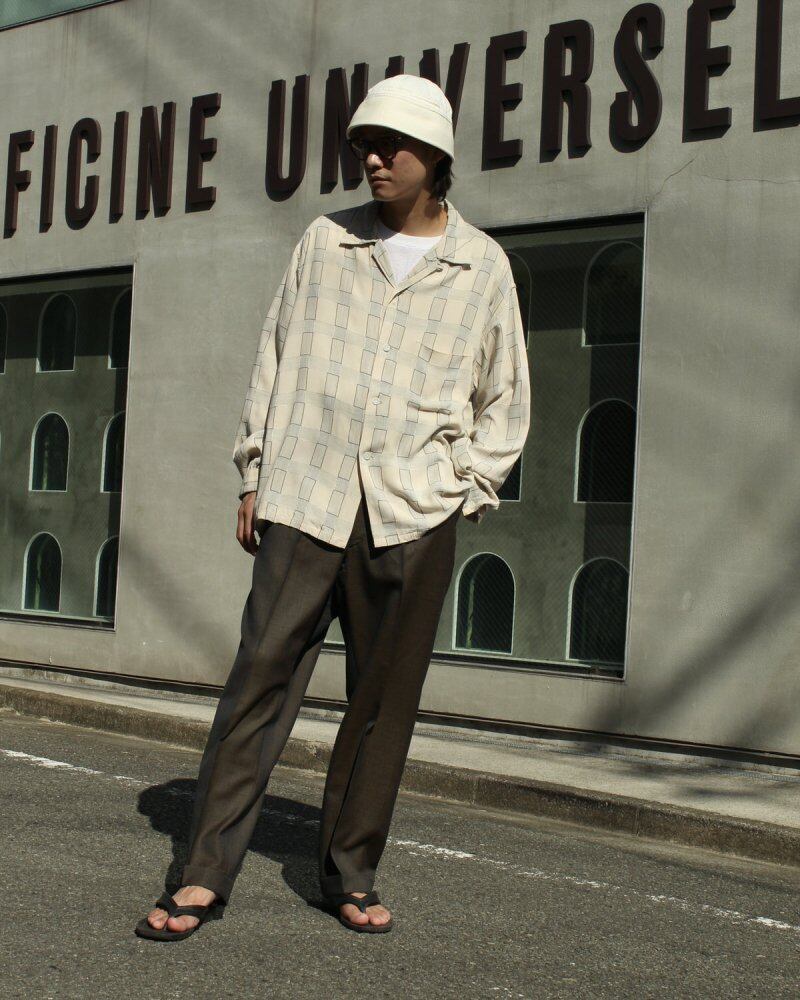Open collar shirt from the 1950s. Rare rayon fabric specification in recent years, unique texture with kasuri pattern and smooth texture. It is a modern design reminiscent of the atomic pattern that was popular in this era with a deep look with gray stripes on a beige base and a three-dimensional woven pattern. Very rare XL size, loose silhouette. Subjectively, it is in good condition as a second-hand item. Since it is an old item, it rarely deteriorates over time. Please check the photos and understand the characteristics of vintage before purchasing.